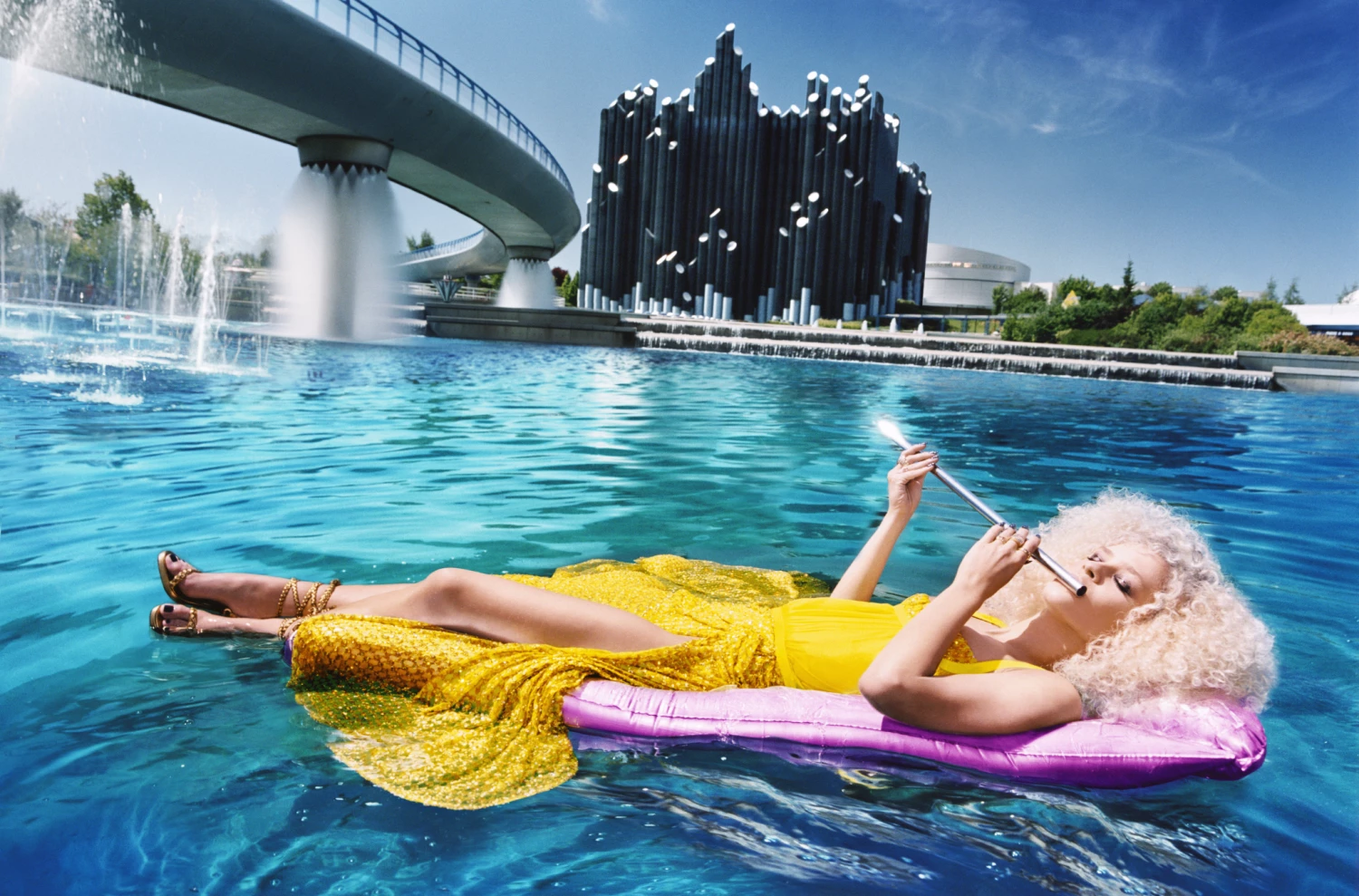 L’opera raffigura una donna sdraiata su un materassino gonfiabile, mentre galleggia sulle acque di un fiume di una città moderna, intenta a suonare il flauto traverso. La donna, appartenente al mondo dello spettacolo, indossa un vestito sontuoso ed ha una capigliatura vistosa.