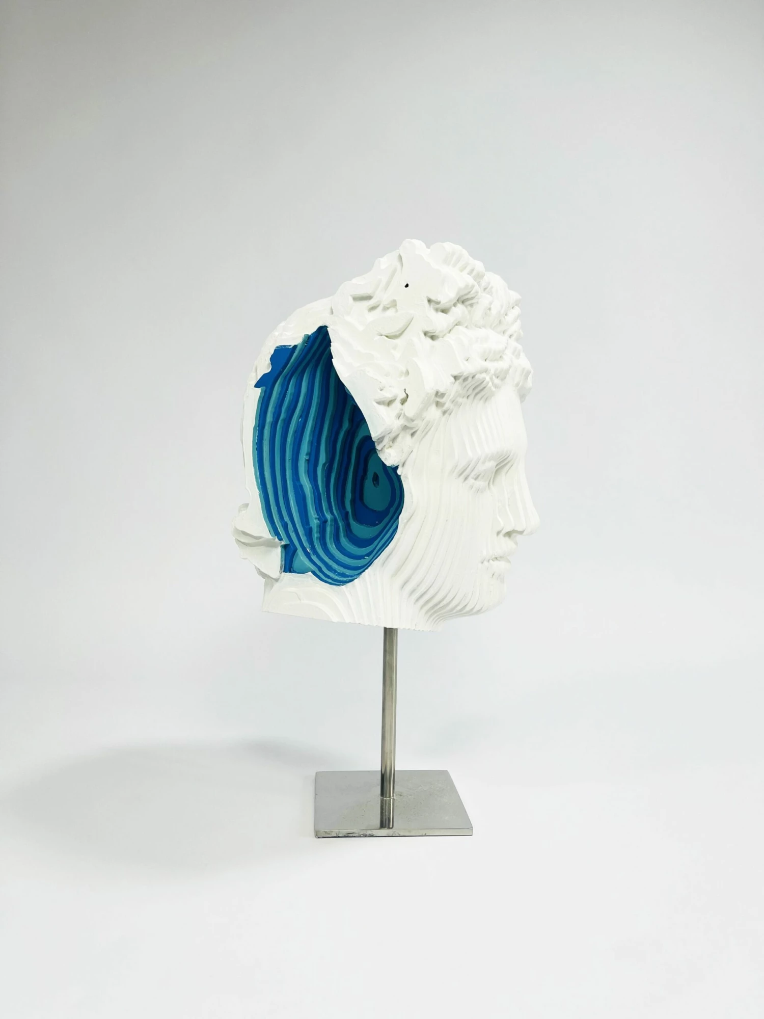 L’opera richiama fortemente il volto di una scultura antica marmorea. Il richiamo al passato e all’antichità è un concetto iconico dell’artista, il quale contamina questa classicità con elementi contemporanei e colorati.