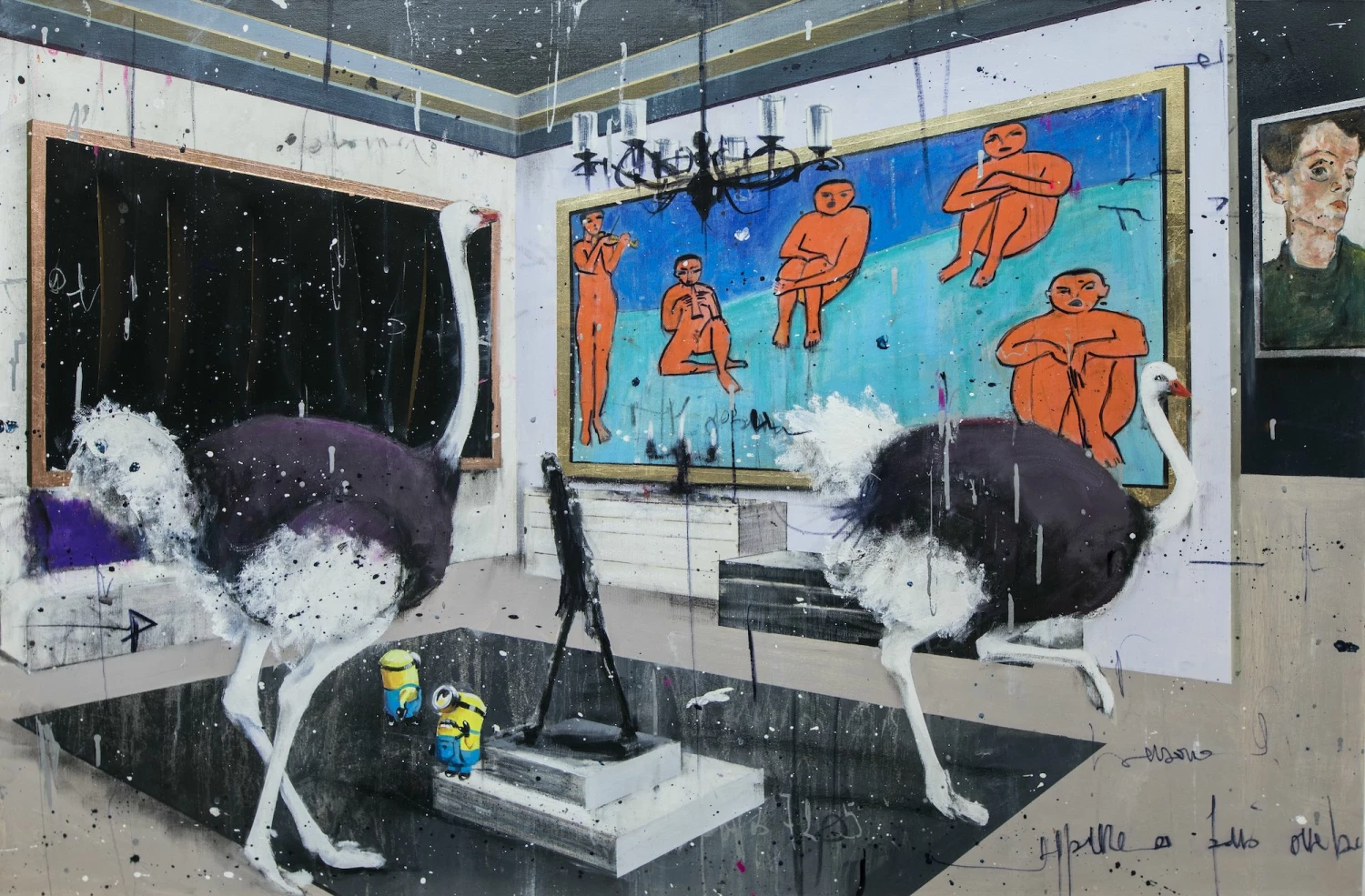 L’artista, oltre agli Struzzi, inserisce nei medesimi ambienti altri soggetti sempre estranei al contesto: Rinoceronti, Navi, Aerei, personaggi dei Minions e dei Simpson.
