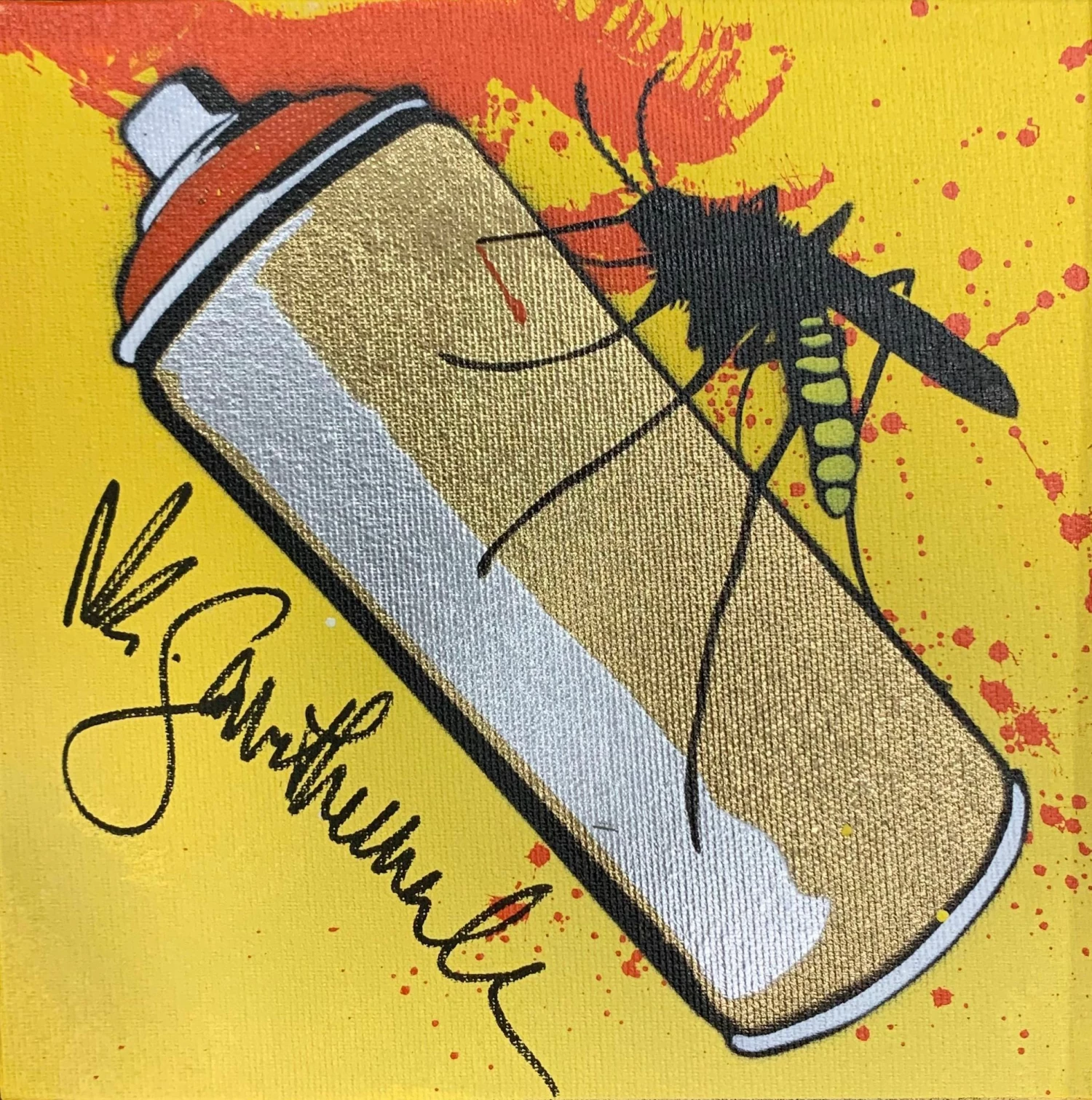 Opera unica su tela dello street artist italiano Mr. Savethewall, Art Is a Serious Matter rappresenta su sfondo giallo una bomboletta spray color oro punta da una zanzara.