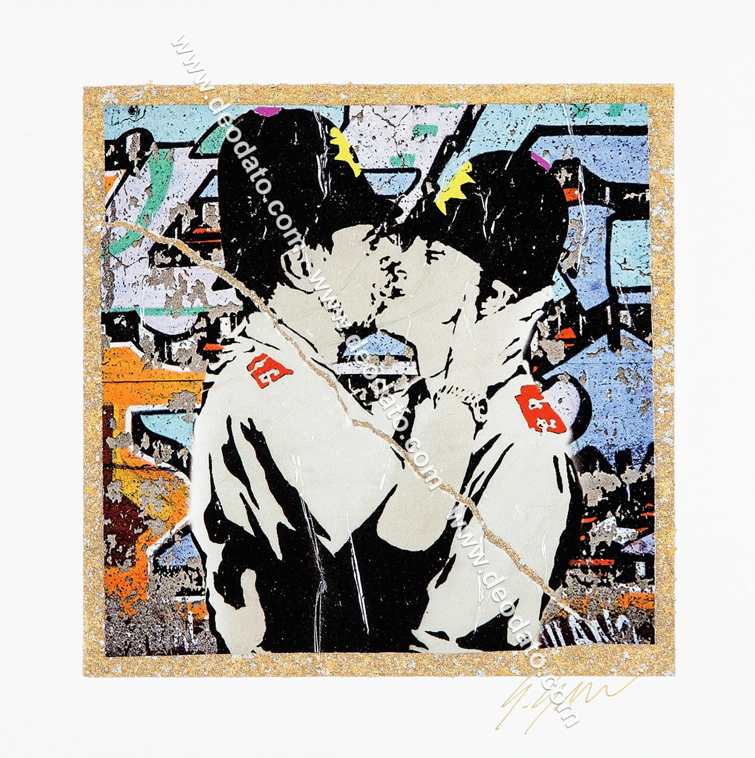 In questa bellissima opera unica l’artista Giuliano Grittini rivisita l’immagine della famosa opera di Banksy “Kissing Coppers”, comparsa per la prima volta su un muro di Brighton in Inghilterra. Attraverso l’uso della “cracker art”, Grittini ripropone immagini di famose opere, icone o figure storiche attraverso varie tecniche tra cui ritagli, assemblaggi, collage, caratterizzati da colori accesi e inserti luminosi e glitterati. Opera unica, firmata in originale dall’artista e provvista del certificato di autenticità.