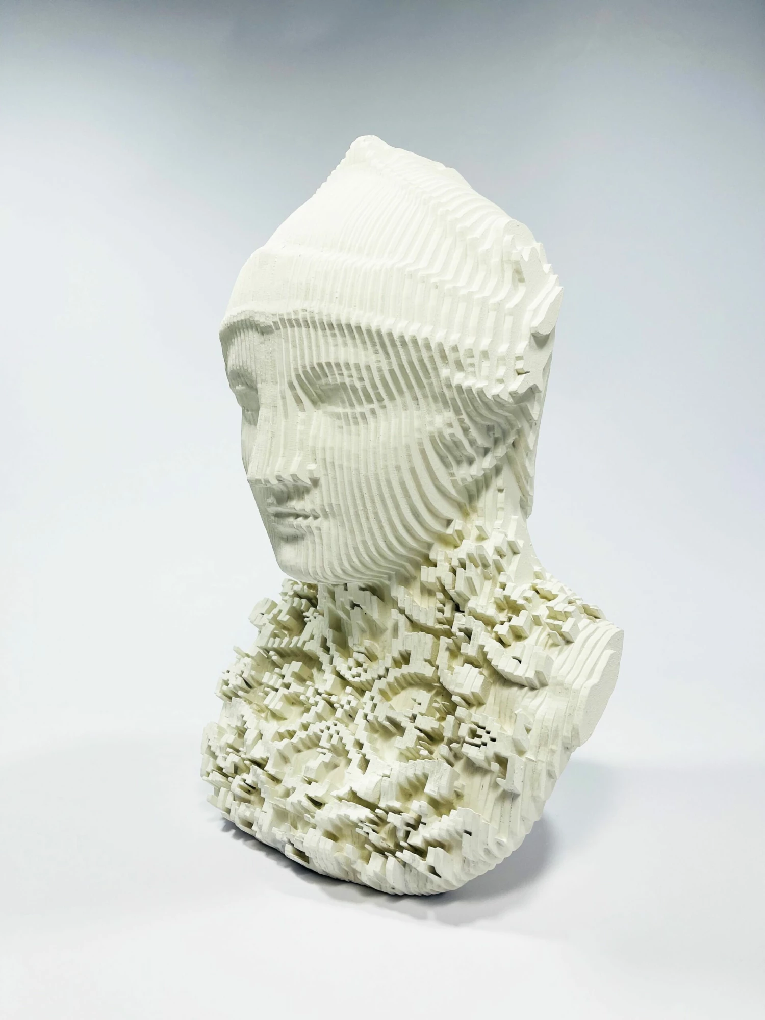 Le sculture di Fortuna hanno come punto di partenza soggetti classici, busti greco-romani che vengono ricreati in legno, con una tecnica che accosta più livelli sfalsati, ricordando quasi una riproduzione digitale.
