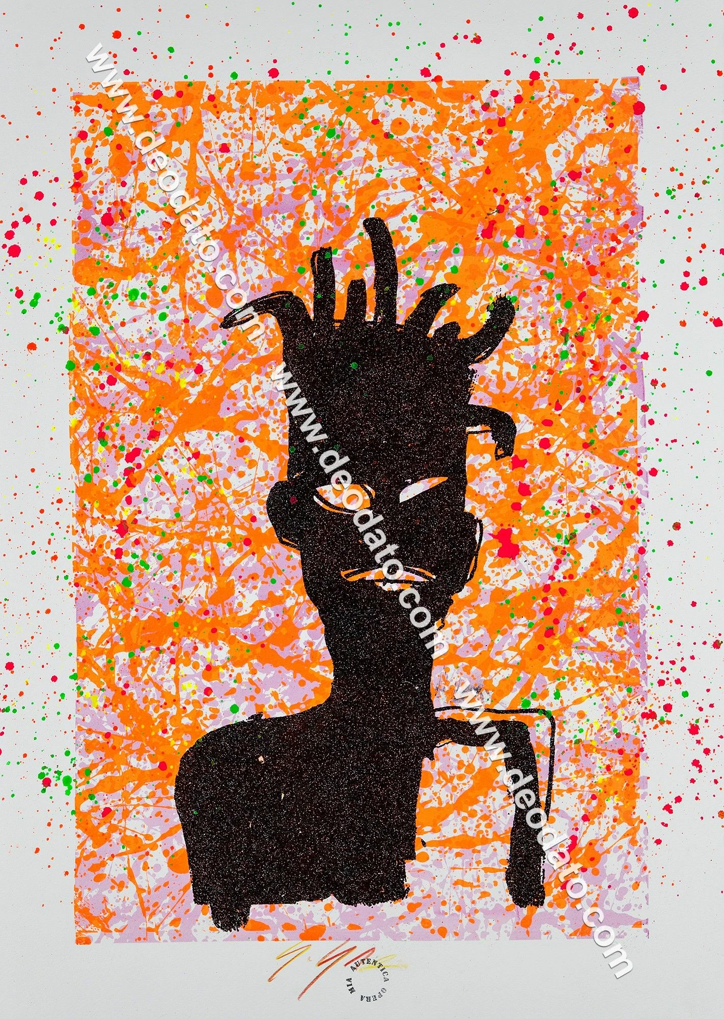 In questa bellissima opera unica l’artista Giuliano Grittini rappresenta la sagoma nera del volto di Basquiat, celebre writer e street artist americano. Il soggetto è circondato da uno sfondo pieno di schizzi di colore arancione, verde e rosa. Attraverso l’uso della “cracker art”, Grittini ripropone immagini di famose opere, icone o figure storiche attraverso varie tecniche tra cui ritagli, assemblaggi, collage, caratterizzati da colori accesi e inserti luminosi e glitterati. Opera unica, firmata in originale dall’artista e provvista del certificato di autenticità.