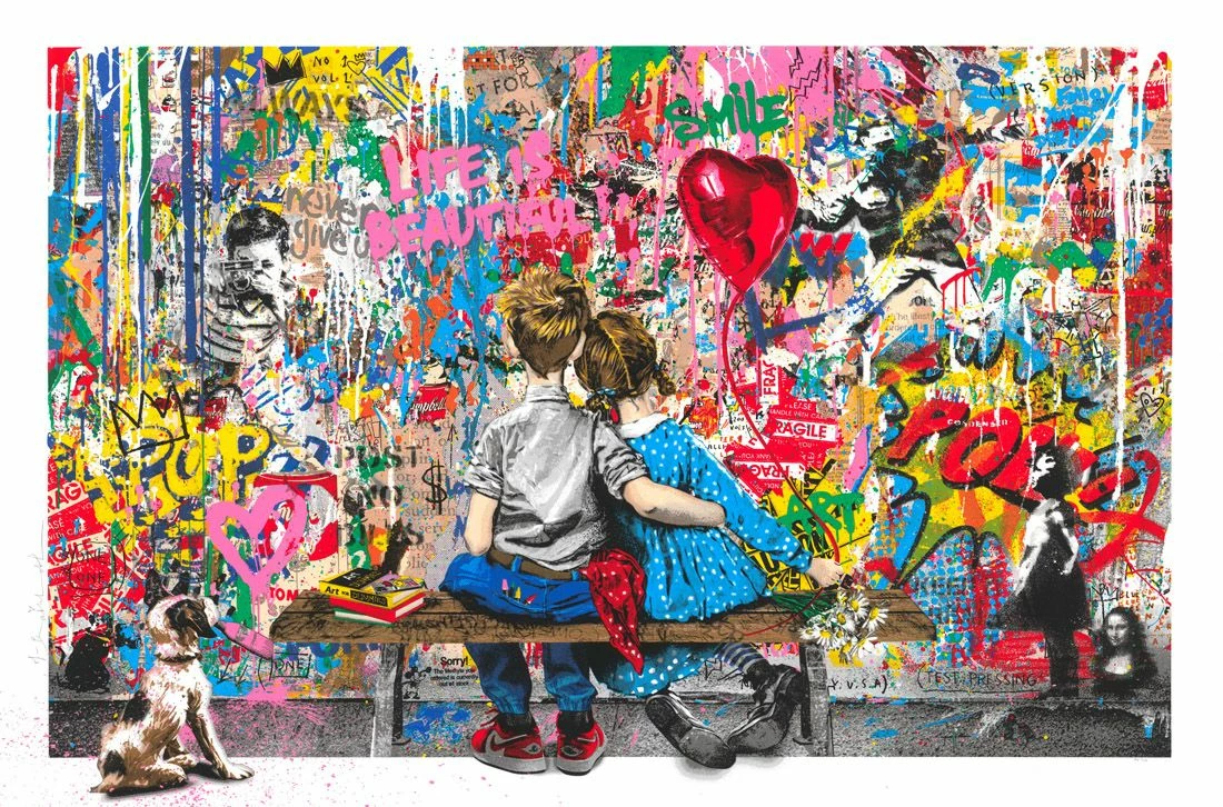Protagonisti della composizione sono un bambino e una bambina che si abbracciano dolcemente mentre ammirano il panorama. I fanciulli siedono su una panchina di legno, che sembra stare per cedere sotto il loro peso. Mr. Brainwash li posiziona di spalle all’osservatore. Oltre ai due fanciulli l’opera presenta altri soggetti ricorrenti della produzione artistica di Mr. Brainwash, come la Balloon Girl e il bambino protagonista della serie di lavori Smile, che è intento a scattare una foto.
