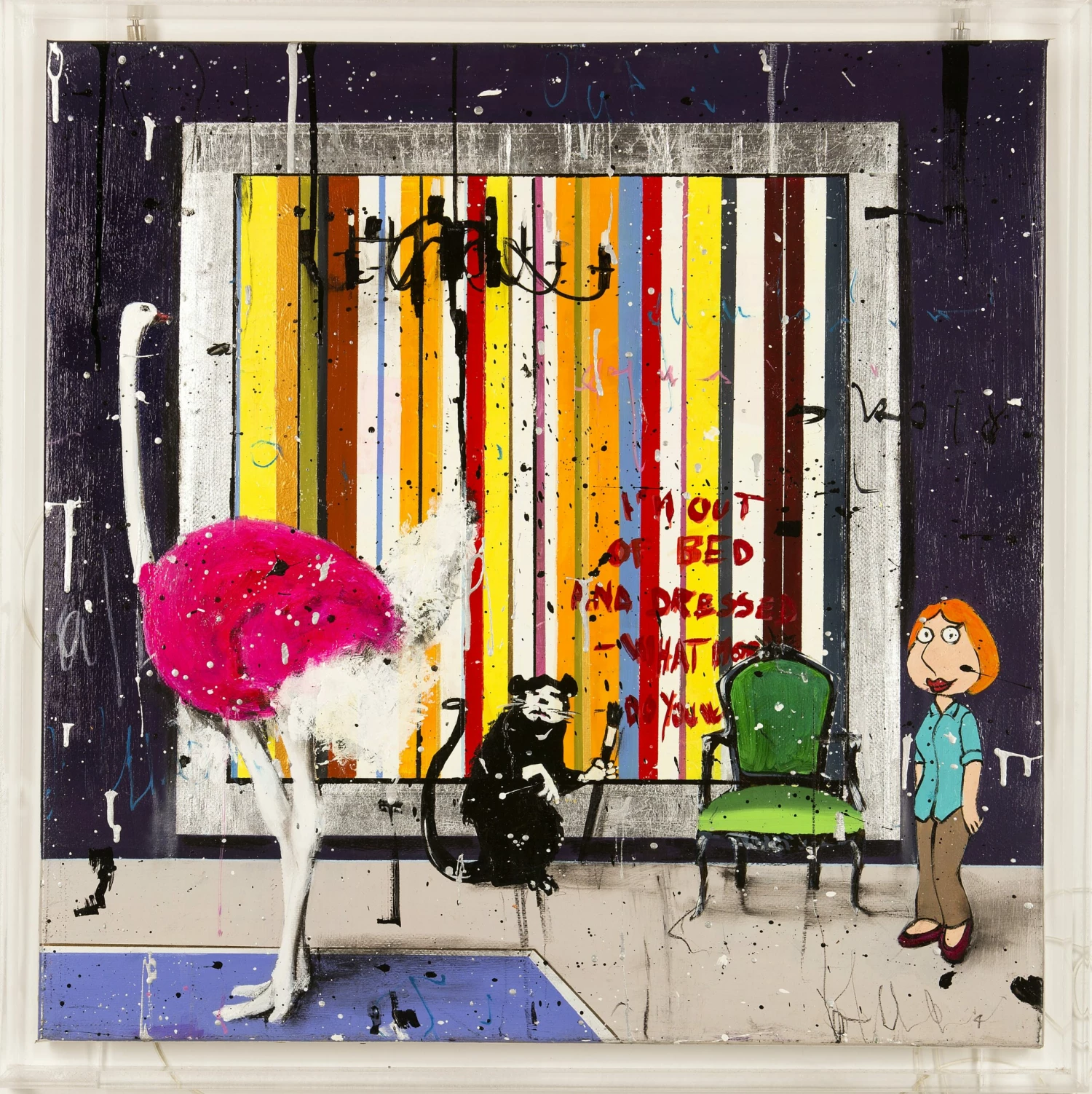 L’opera di Angelo Accardi Blend rappresenta uno struzzo rosa, animale iconico dell’artista, in un interno caratterizzato da riferimenti al mondo dell’arte e alla cultura di massa. Nello specifico troviamo un ratto con un pennello in mano (riferimento a Banksy) e una riproduzione di Lois del noto cartone I Griffin.
