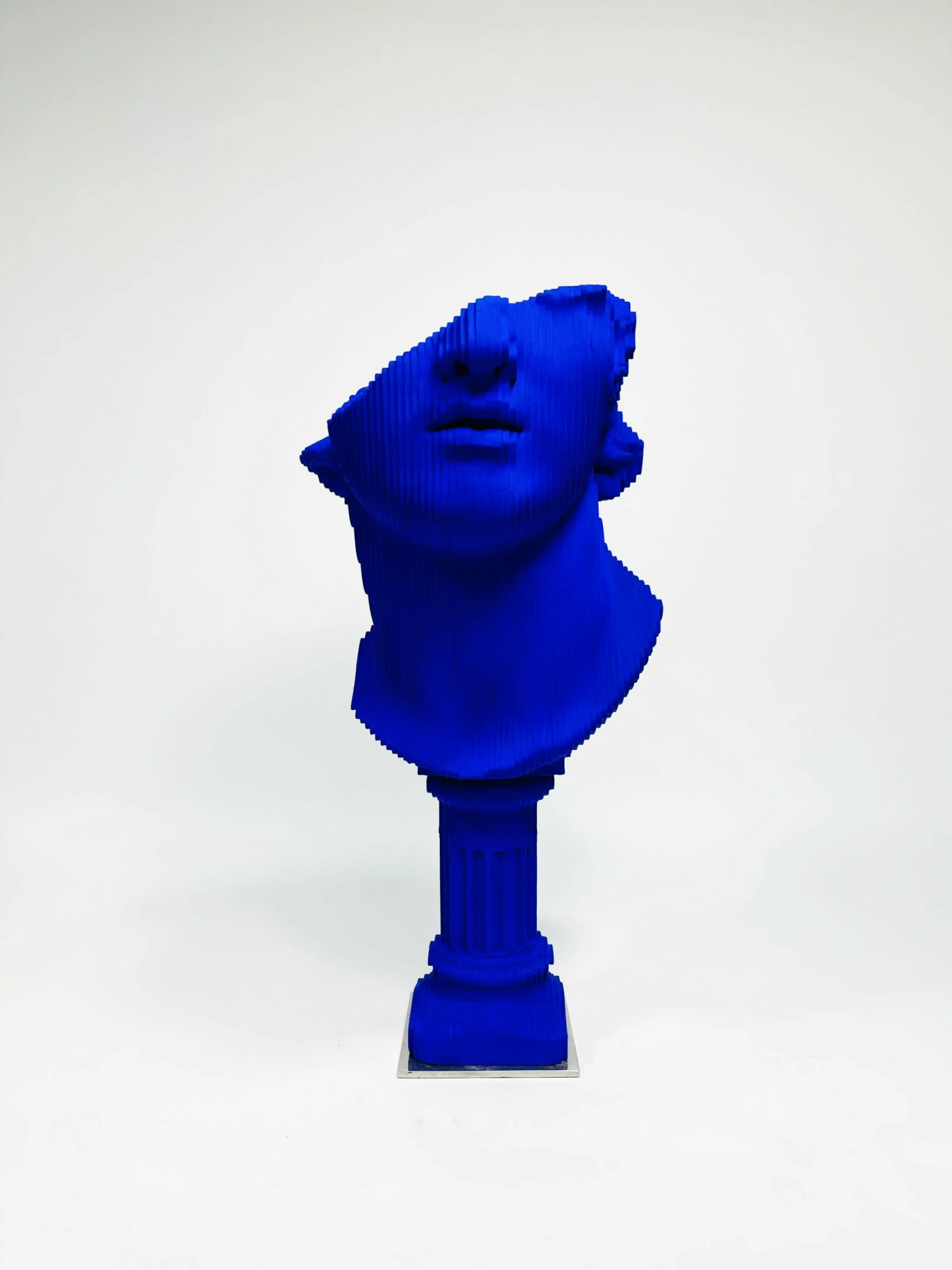L’opera unica di Daniele Fortuna, Blue Ancient è una scultura realizzata in legno con colori acrilici.