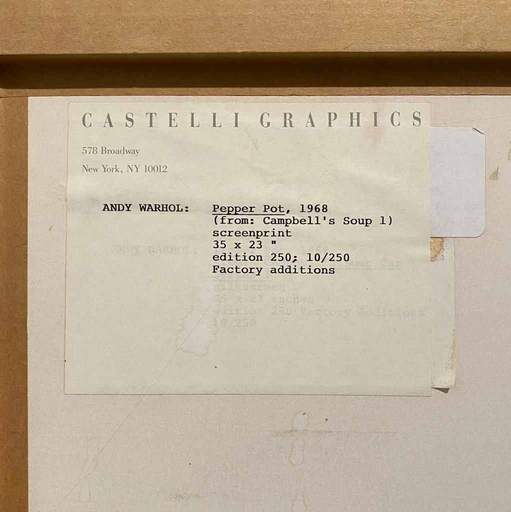 Campbell’s Soup – Pepper Pot è firmata e numerata (10/250) in originale dall’artista Andy Warhol. Sul retro dell’opera è presente l’autentica della Galleria Castelli, fondata da Leo Castelli nel 1957. La Galleria Castelli, situata a New York, sostiene il lavoro di artisti pop, minimal e concettuali tra cui Jasper Johns, Joseph Kosuth, Roy Lichtenstein e lo stesso Andy Warhol.