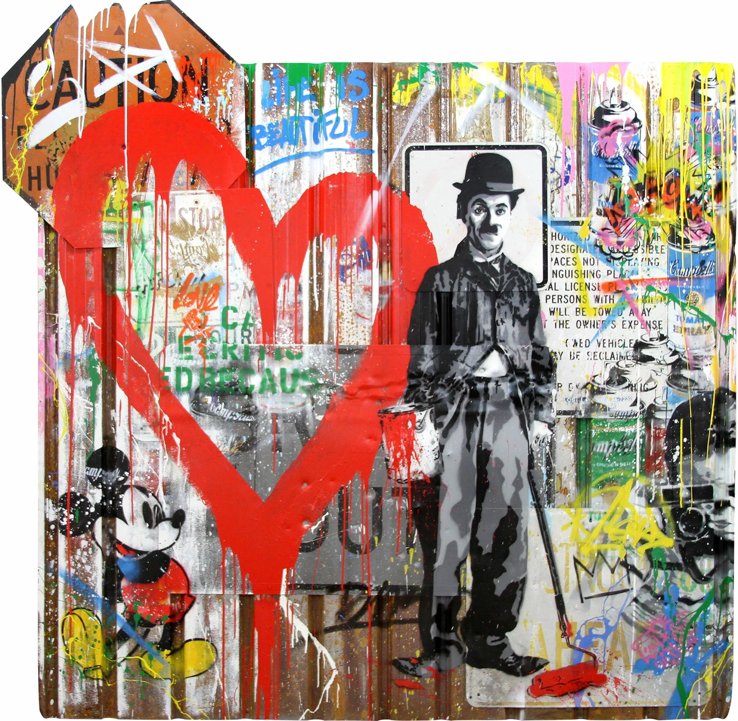 L’opera unica di Mr. Brainwash Chaplin misura 220×226 cm, è firmata in originale dall’artista ed è stata realizzata nel 2016. In primo piano, su uno sfondo colorato, l’artista raffigura uno dei personaggi più ricorrenti nella sua arte: Charlie Chaplin.