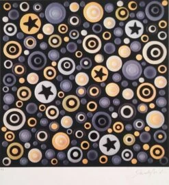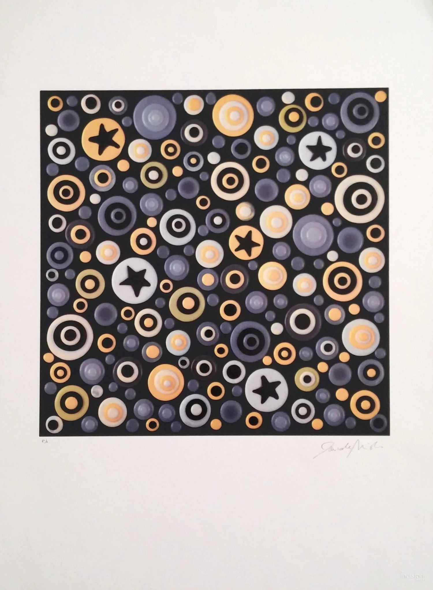 L’artista definisce queste composizioni, formato da molte sfere di diversi colori, Coriandoli. In questa splendida opera firmata e numerata PA (prova d’artista), Davide Nido ci offre i suoi abituali agglomerati rotondi su uno sfondo nero.