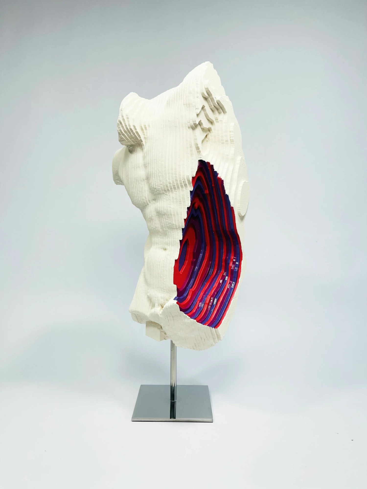Il colore bianco è accompagnato da una scanalatura ricca di colori all’interno del volto. L’artista stesso ha coniato un termine Colormination per rappresentare questa contaminazione cromatica che avviene all’intero delle sue sculture.
