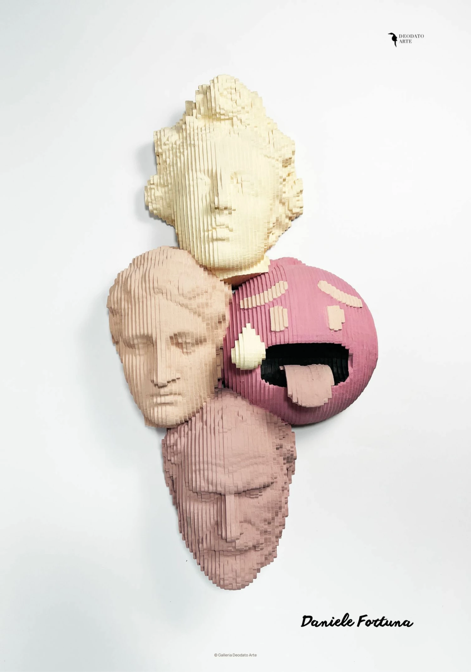 Tipica è la fusione tra passato e presente all’interno della stessa opera; infatti, se il soggetto riprende la classicità e l’antichità, i colori accesi e la presenza di una emoji riportano la scultura nella contemporaneità.