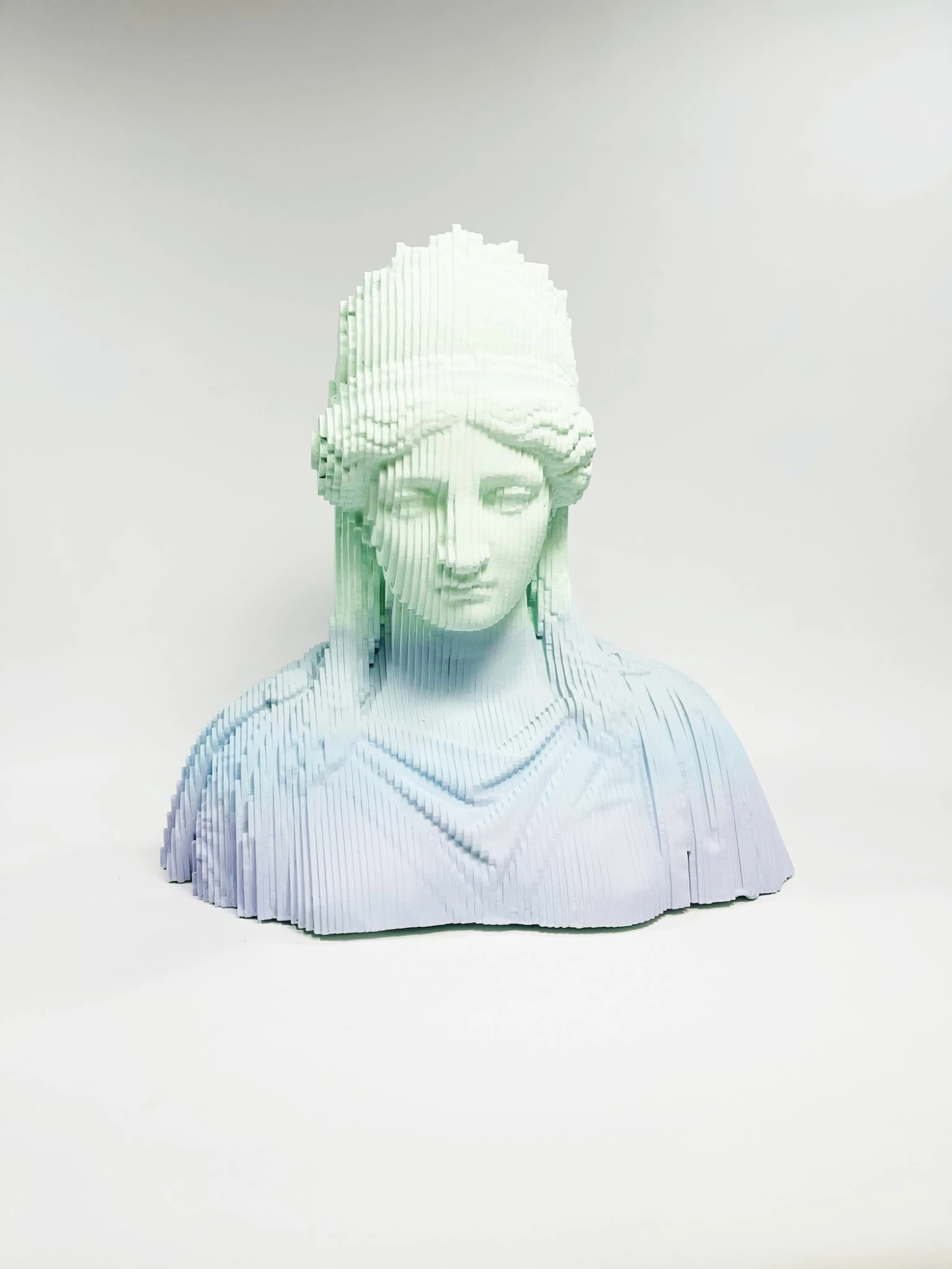 Le sculture di Fortuna hanno come punto di partenza soggetti classici, busti greco-romani che vengono ricreati in legno, con una tecnica che accosta più livelli sfalsati, ricordando quasi una riproduzione digitale.