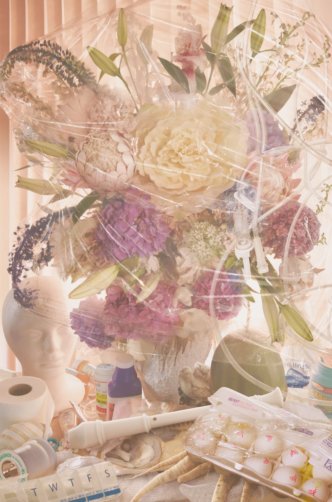 Al centro vi è una natura morta, con elementi prevalentemente floreali, contornati da oggetti di uso quotidiano: un rotolo di carta igienica, un flauto traverso, un porta pastiglie giornaliero vicino ad altri oggetti per la medicazione, un modello di testa in plastica bianca.