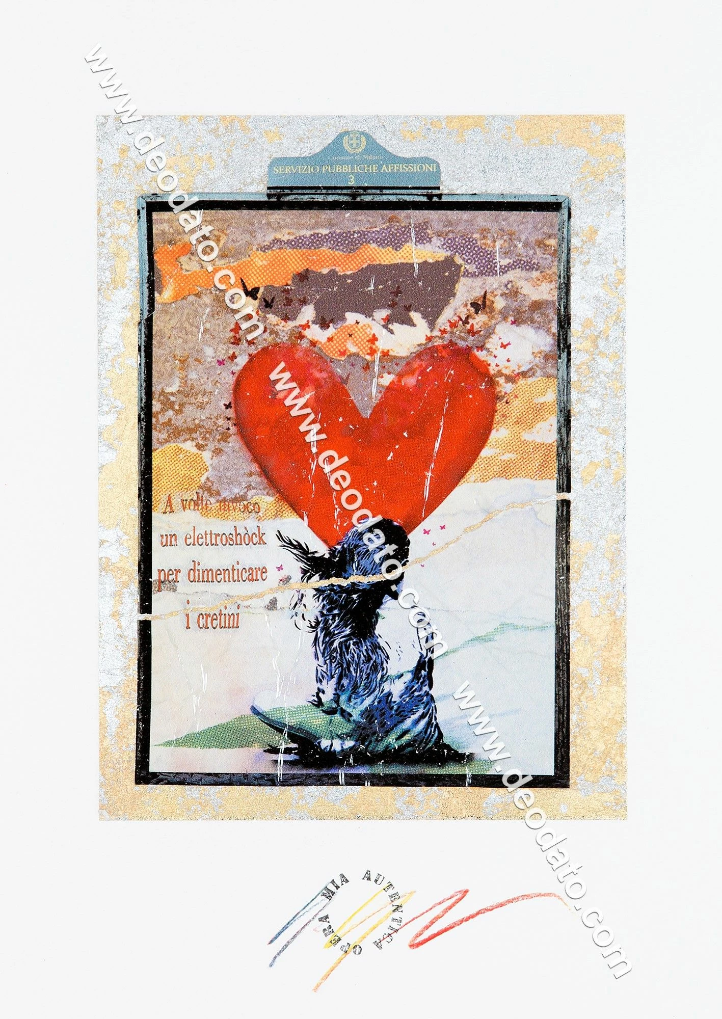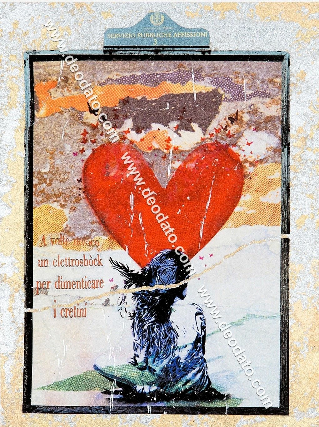 In questa bellissima opera unica l’artista Giuliano Grittini rappresenta il graffito di una bambina di spalle con un cuore rosso. Di fianco compare la scritta “A volte invoco un elettroshock per dimenticare i cretini”, celebre frase di Alda Merini, poetessa e scrittrice italiana. Attraverso l’uso della “cracker art”, Grittini ripropone immagini di famose opere, icone o figure storiche attraverso varie tecniche tra cui ritagli, assemblaggi, collage, caratterizzati da colori accesi e inserti luminosi e glitterati. Opera unica, firmata in originale dall’artista e provvista del certificato di autenticità.