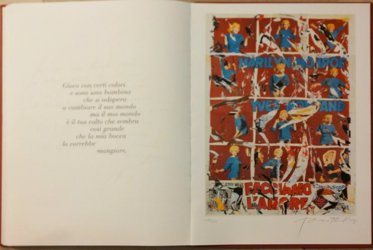 Dècollages di Mimmo Rotella proveniente dal libro: “MARILYN Bellezza eterna”, di Mimmo Rotella e Alda Merini. Questo celebre Dècollages è abbinato ad una Poesia inedita di Alda Merini, proprio come tutti gli altri Dècollages presenti nel libro; tiratura: 199 esemplari, tutti firmati e numerati. In quest’opera ritroviamo la celebre locandina del film Facciamo l’Amore (Let’s Make Love), 1960 di George Cukor, con Marilyn Monroe e Yves Montand.