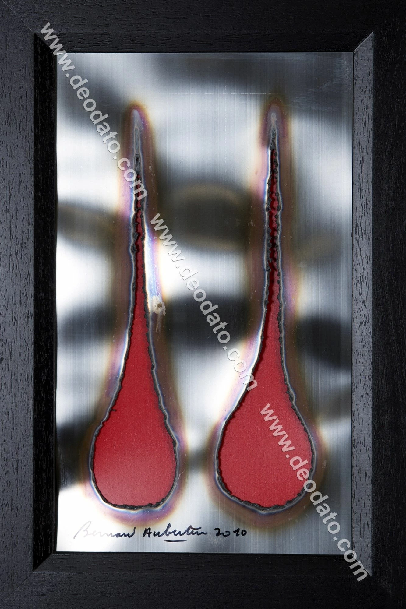 Lamiera bruciata con l’intervento della fiamma ossidrica che crea due forme nelle quali risalta lo sfondo rosso, caratteristica tipica dell’artista Bernar Aubertin. Il prezzo dell’opera include la cornice ed il catalogo con copertina rigida Bernard Aubertin. Fer Brûlé sul quale è pubblicata l’opera a pagina 165. Inoltre è archiviata dall’artista stesso con n°10451.
