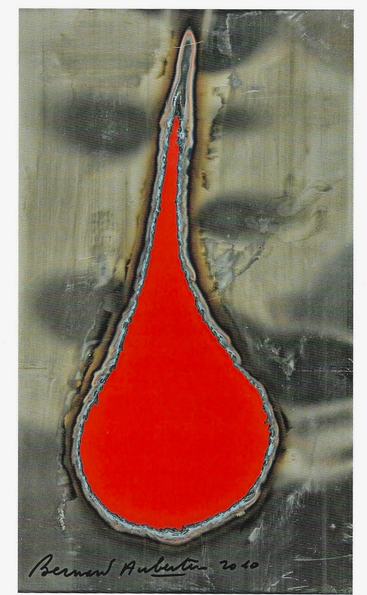 Lamiera bruciata con l’intervento della fiamma ossidrica che crea una forma tondeggiante nelle quali risalta lo sfondo rosso, caratteristica tipica dell’artista Bernard Aubertin. Il prezzo dell’opera include la cornice ed il catalogo con copertina rigida Bernard Aubertin. Fer Brûlé sul quale è pubblicata l’opera a pagina 122. Inoltre l’opera è anche stata archiviata dall’artista con n° 10485.