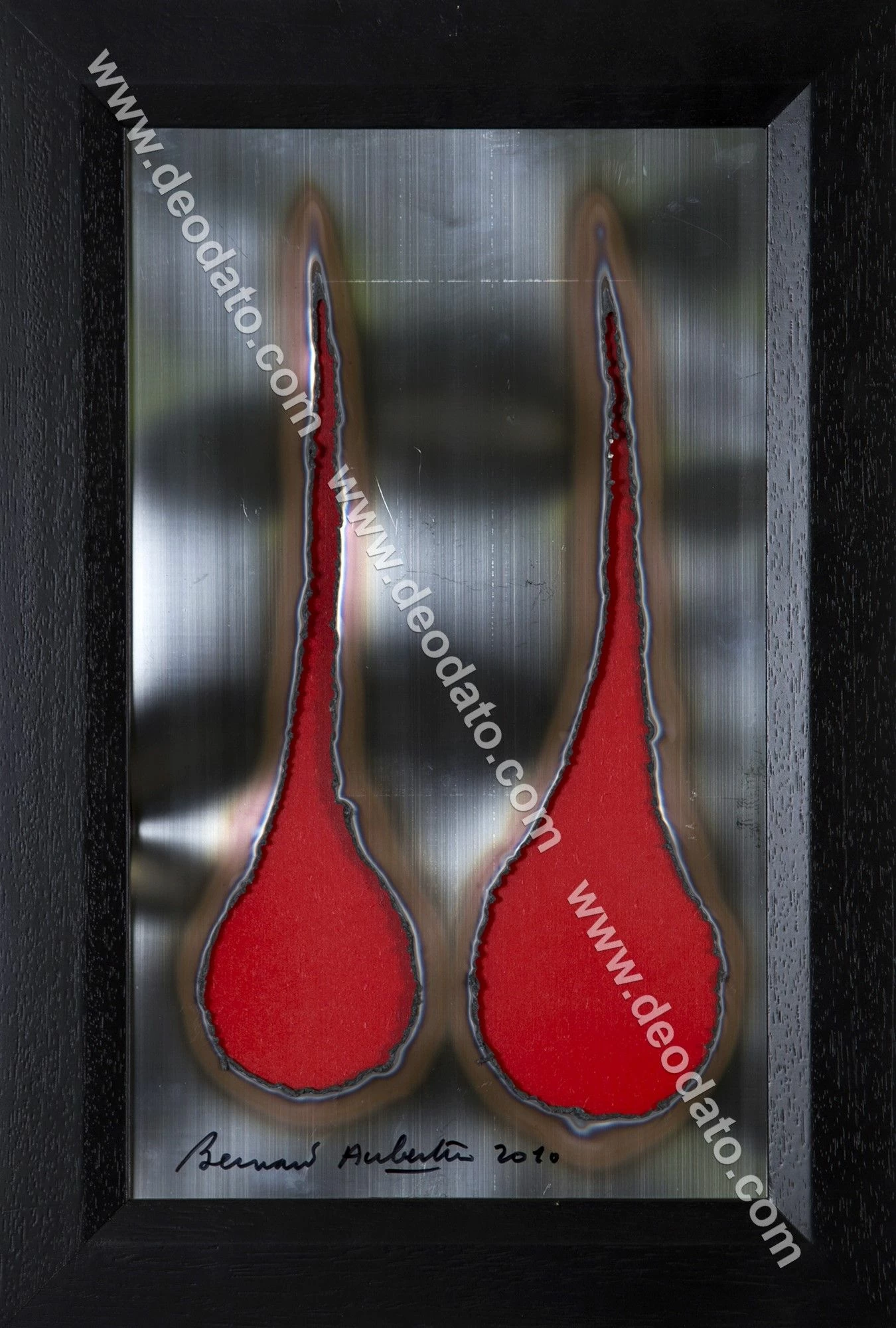 Lamiera bruciata con l’intervento della fiamma ossidrica che crea due forme tondeggianti nelle quali risalta lo sfondo rosso, caratteristica tipica dell’artista Bernard Aubertin. Il prezzo dell’opera include la cornice ed il catalogo con copertina rigida Bernard Aubertin. Fer Brûlé sul quale è pubblicata l’opera a pagina 140. Inoltre l’opera è anche stata archiviata dall’artista con n° 10519.