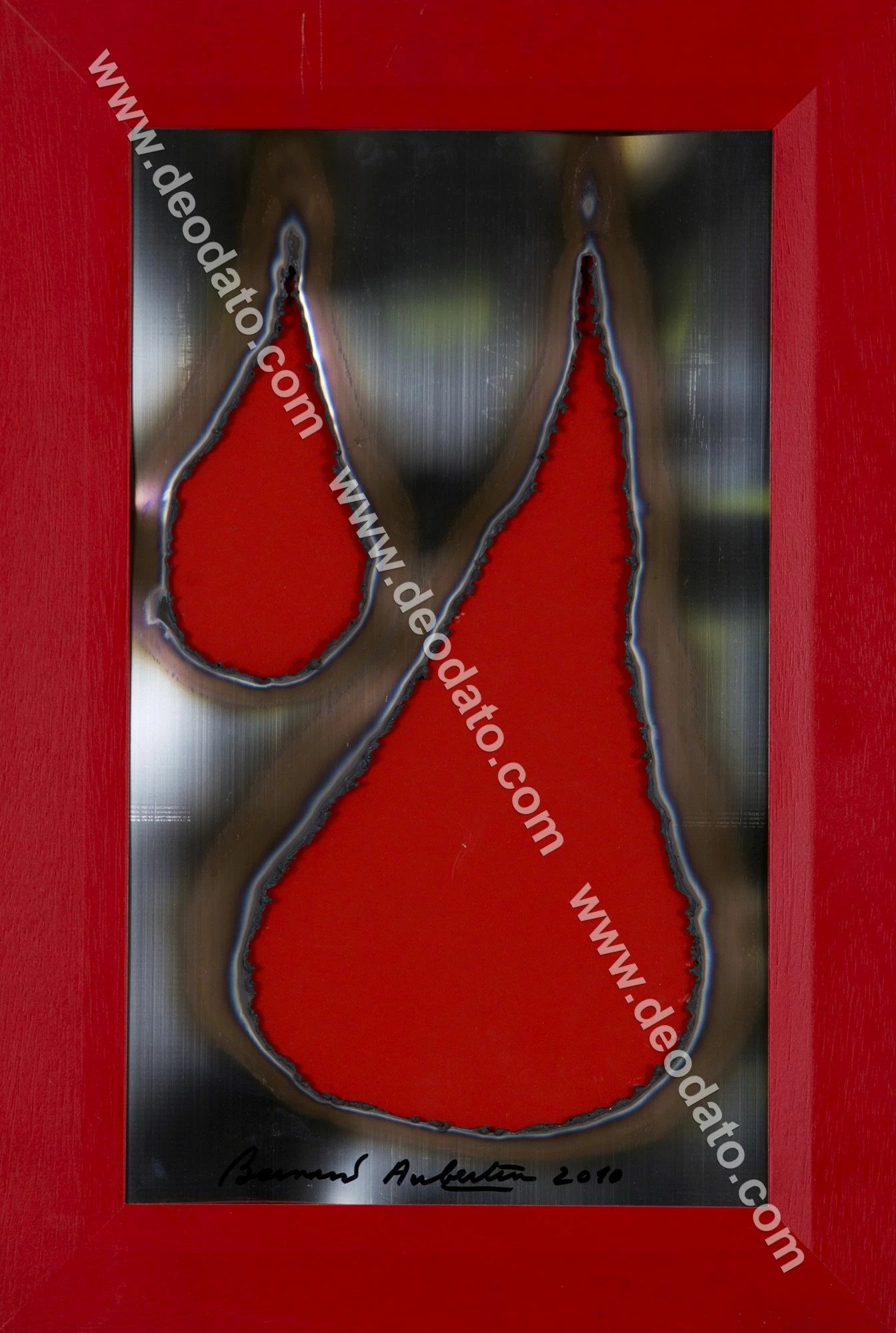 Lamiera bruciata con l’intervento della fiamma ossidrica che crea due forme nelle quali risalta lo sfondo rosso, caratteristica tipica dell’artista Bernar Aubertin. Il prezzo dell’opera include la cornice ed il catalogo con copertina rigida Bernard Aubertin. Fer Brûlé sul quale è pubblicata l’opera a pagina 40. Inoltre è archiviata dall’artista stesso con n°9487.
