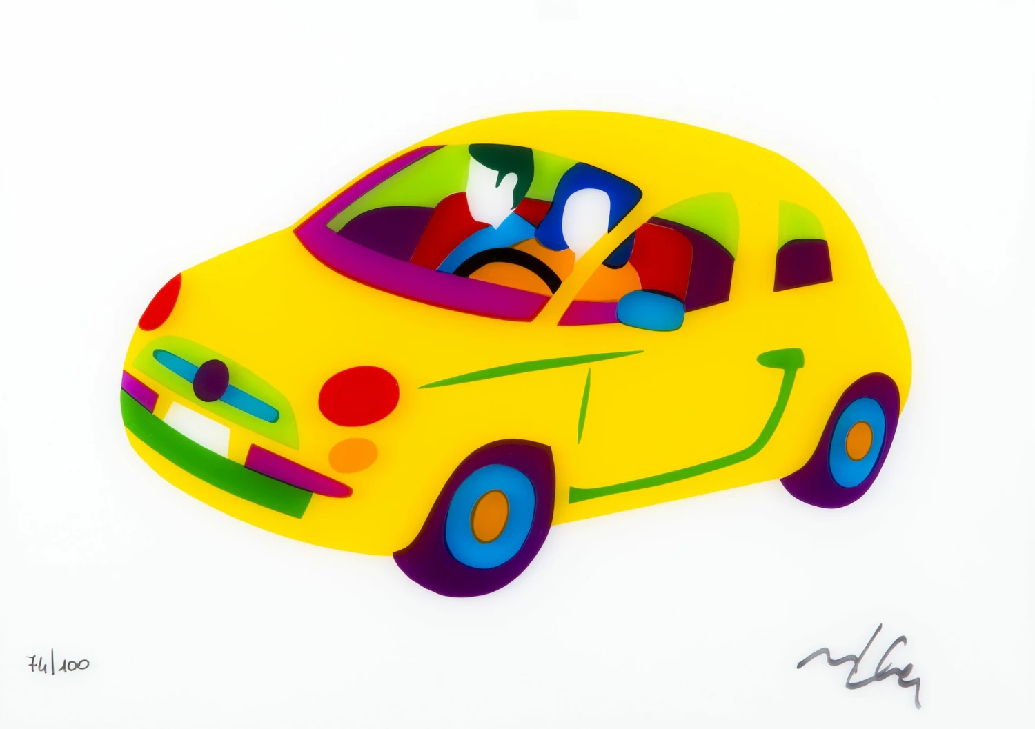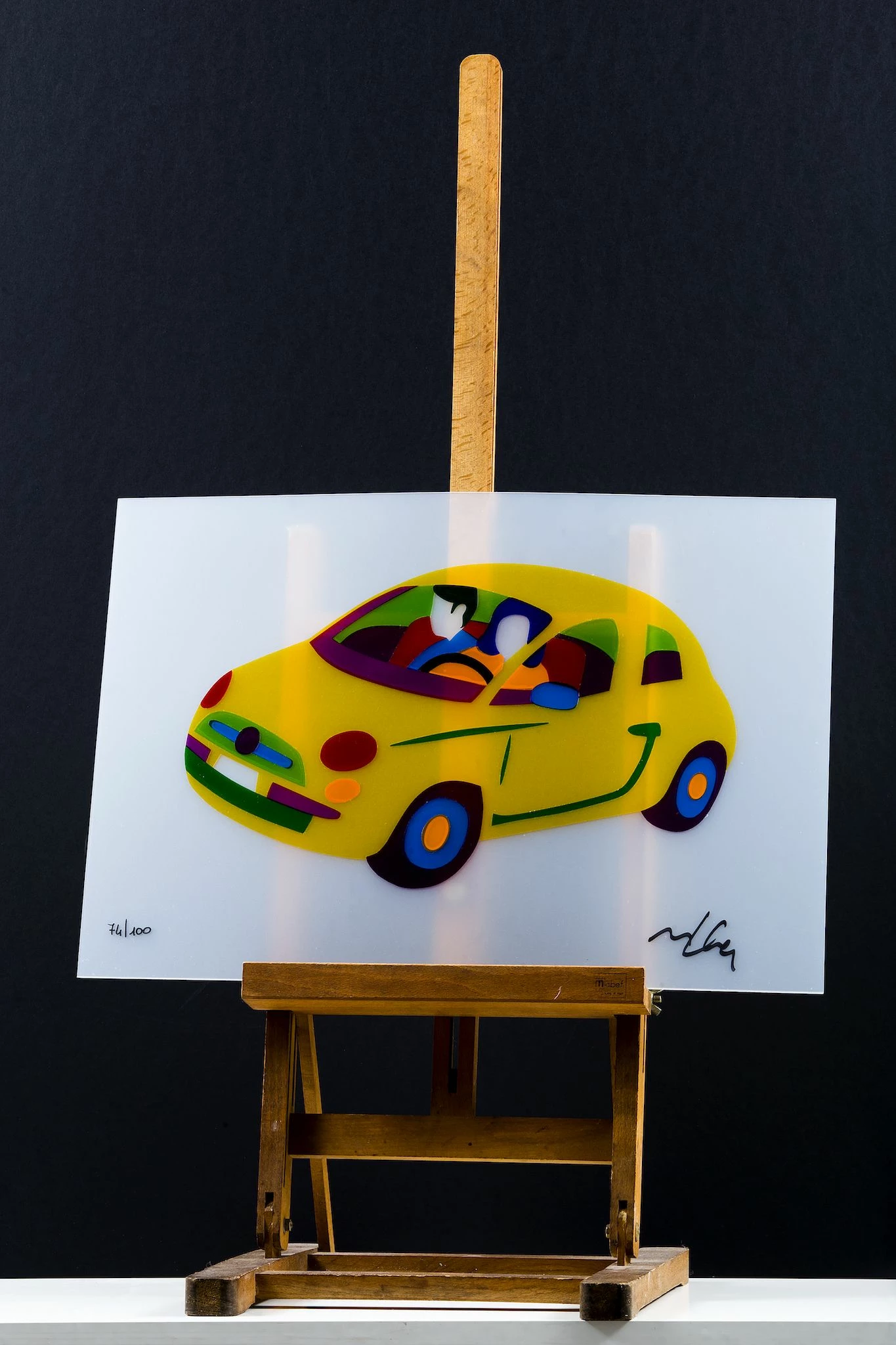L’opera Fiat 500 Fluo (Gialla) di Marco Lodola misura 35×50 cm ed è un sericollage realizzato a mano su PVC.