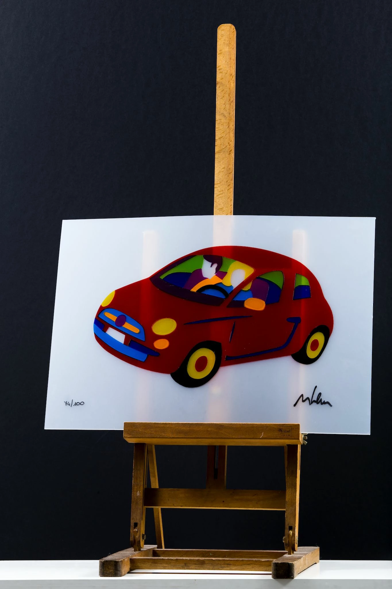 L’opera Fiat 500 Fluo (Rossa) di Marco Lodola misura 35×50 cm ed è un sericollage realizzato a mano su PVC.