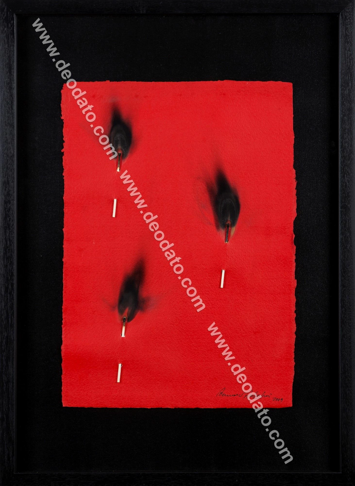 Cartoncino fatto a mano e pitturato di rosso con tracce di bruciature dei tre cerini inseriti verticalmente sulla superficie del foglio. Il prezzo dell’opera è comprensivo di cornice con vetro e catalogo. Oltre ad essere pubblicata sul catalogo Bernard Aubertin. Dessin de Feu sur Papier , a cura di Archivio Nordest a pagina 95, l’opera è anche stata archiviata dall’artista con n° 1802.