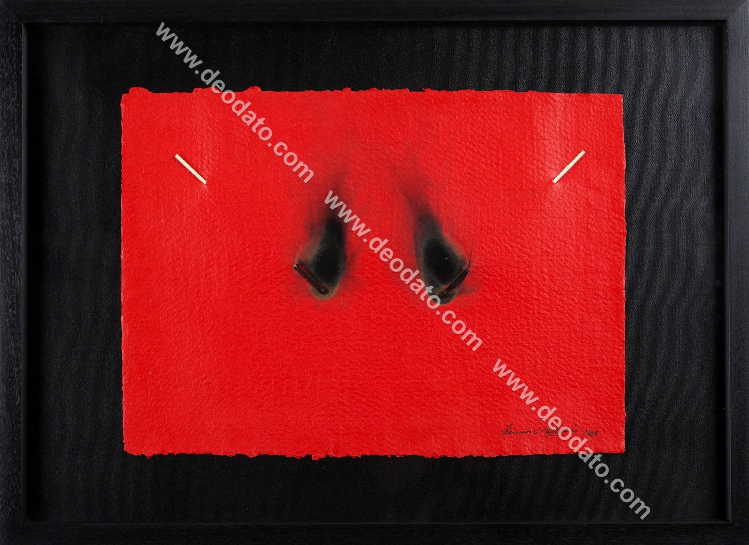 Cartoncino fatto a mano e pitturato di rosso con tracce di bruciature di due cerini inseriti diagonalmente l’uno verso l’altro sulla superficie del foglio. Il prezzo dell’opera è comprensivo di cornice con vetro e catalogo. Oltre ad essere pubblicata sul catalogo Bernard Aubertin. Dessin de Feu sur Papier , a cura di Archivio Nordest a pagina 100, l’opera è anche stata archiviata dall’artista con n° 1816.