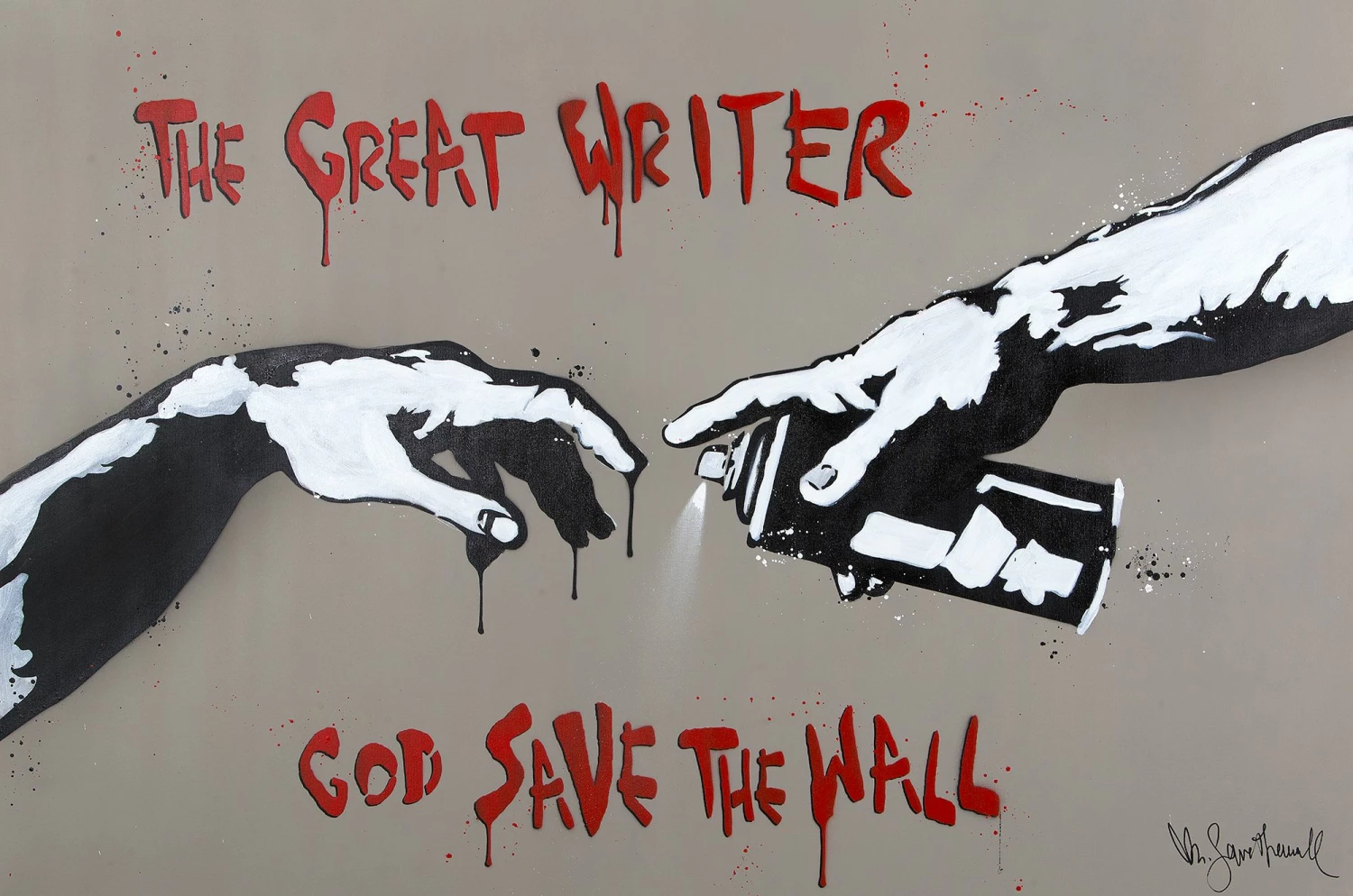 Le mani che stanno per toccarsi, in Michelangelo simbolo del momento della creazione, si stanno ora passando una bomboletta spray, il medium artistico preferito dagli street artist. Intorno la scritta “The Great Writer God Save The Wall”, gioco di parole con il motto “God Save the Queen” che diventa ora un manifesto della poetica dell’artista, da sempre contrario all’imbrattamento dei muri pubblici.