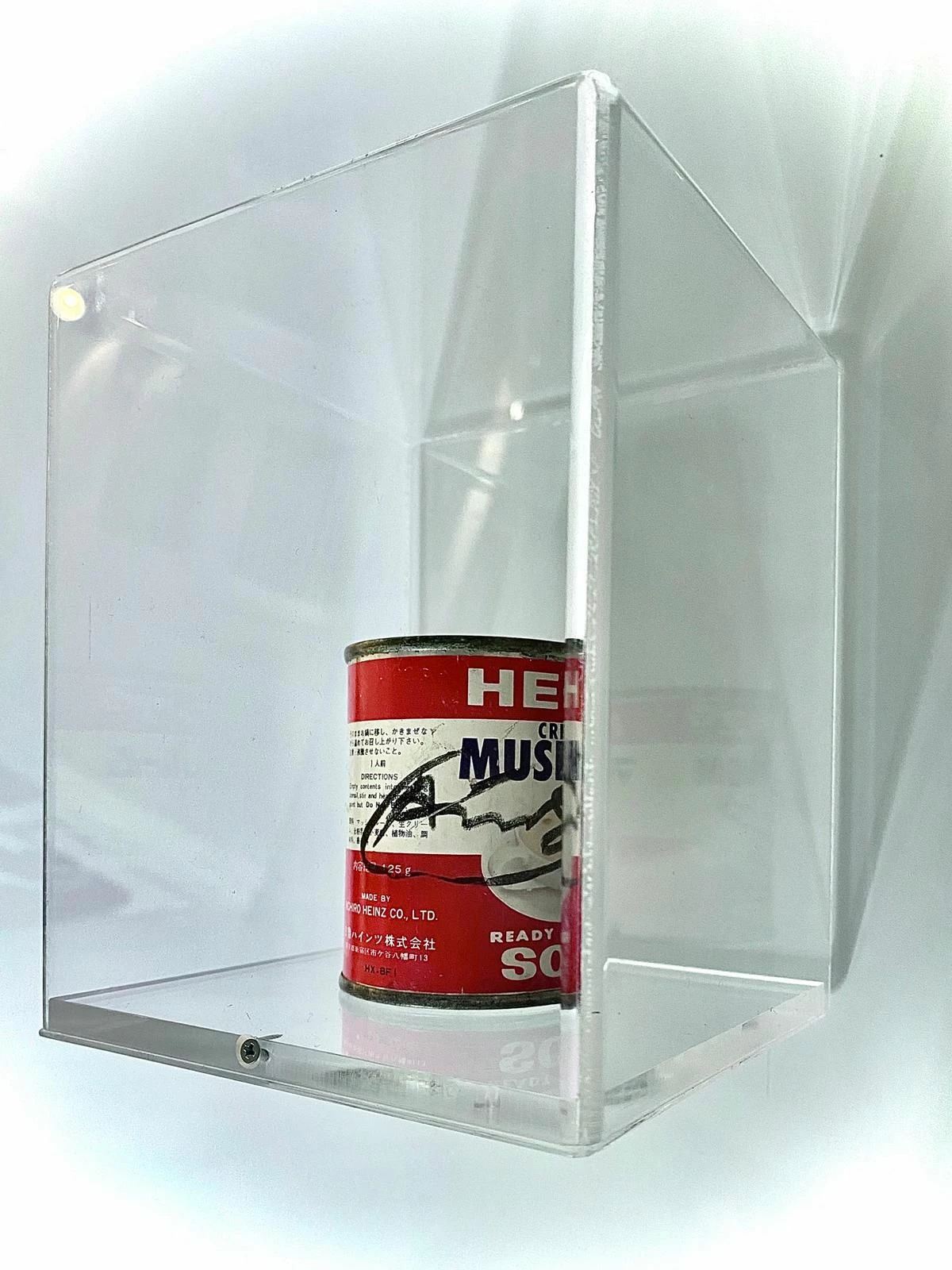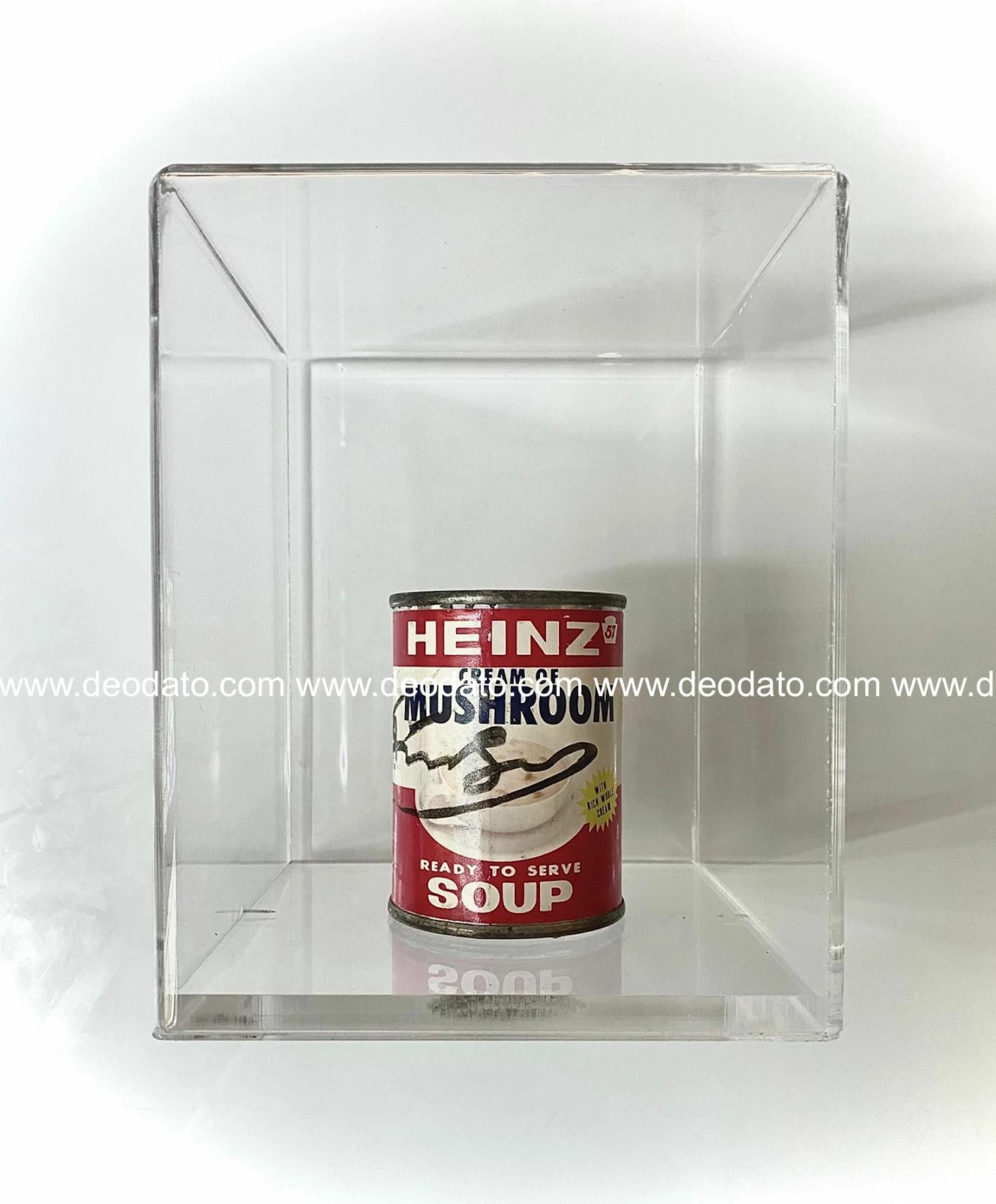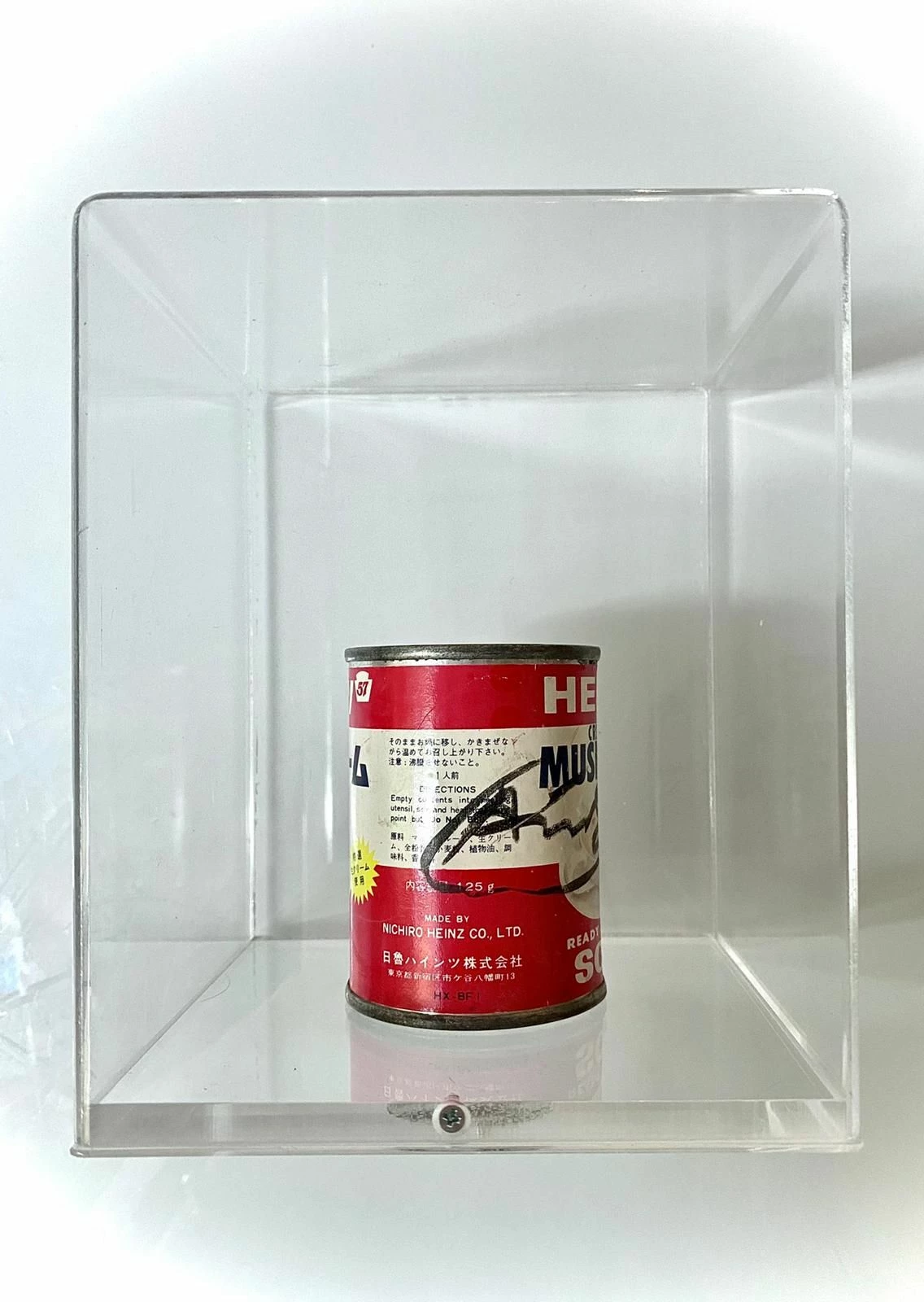 In questo caso ci troviamo di fronte all’oggetto reale, così spesso rappresentato da Warhol: la lattina ancora sigillata Heinz, Cream of Mushrooms, autografata dall’artista stesso con pennarello nero e finemente chiusa all’interno di una teca di vetro.