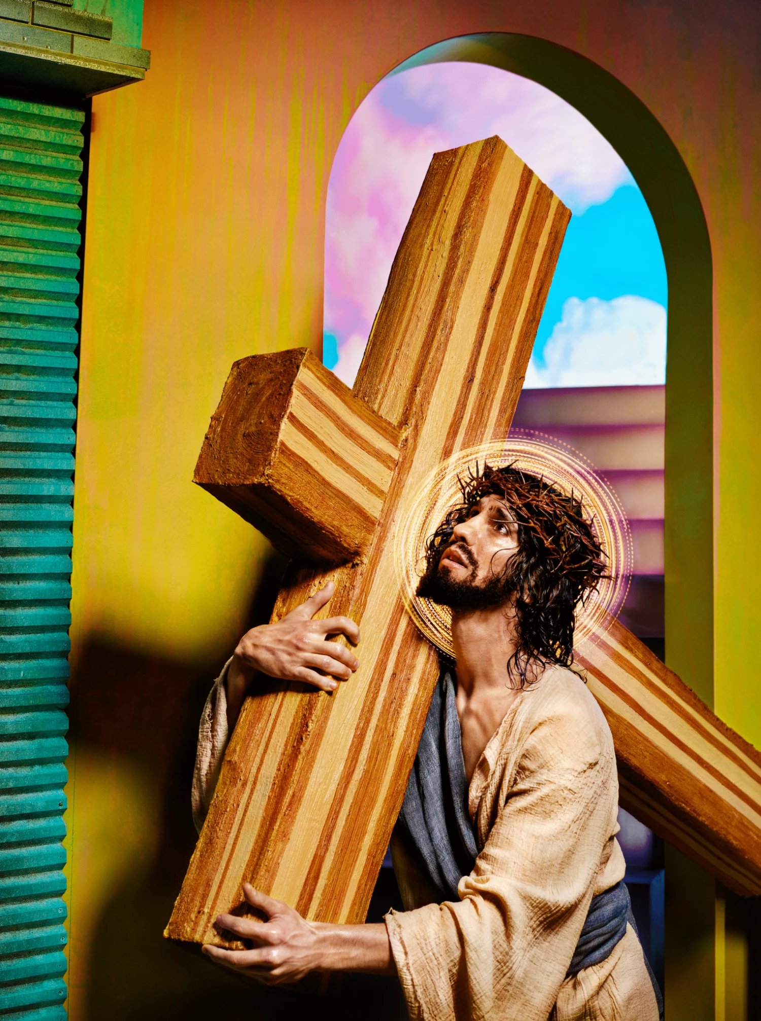 La Strada della Via Crucis altro non è che un percorso di devozione cristiano che consiste nel passare processionalmente per 14 croci, soffermandosi ad ognuna di loro per pregare Gesù. Queste croci vengono chiamate stazioni: a questo cammino spirituale di stampo cristiano si ispira LaChapelle per la sua serie del 2023 Station of the Cross.