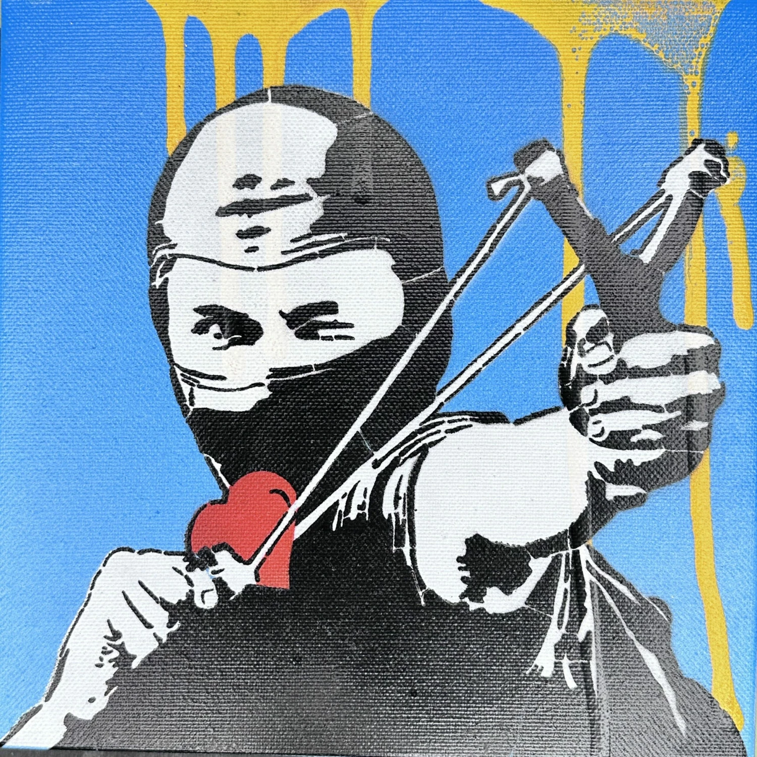 Un uomo, dal volto coperto, regge una fionda con la quale sta per scagliare niente meno che un cuore. La sua figura ci ricorda quella di un manifestante e richiama il mondo della street art e dell’attivismo, mentre il cuore è un segno di amore, ma di un amore che può portare a compiere errori e a fare scelte sbagliate.