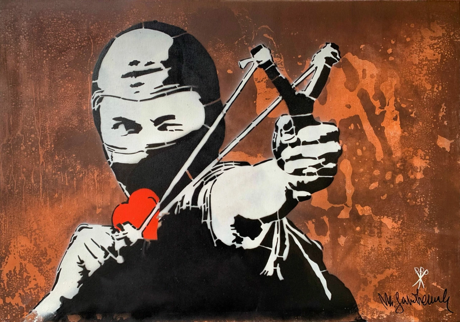 Un uomo, dal volto coperto, regge una fionda con la quale sta per scagliare niente meno che un cuore. La sua figura ci ricorda quella di un manifestante e richiama il mondo della street art e dell’attivismo, mentre il cuore è un segno di amore, ma di un amore che può portare a compiere errori e a fare scelte sbagliate.