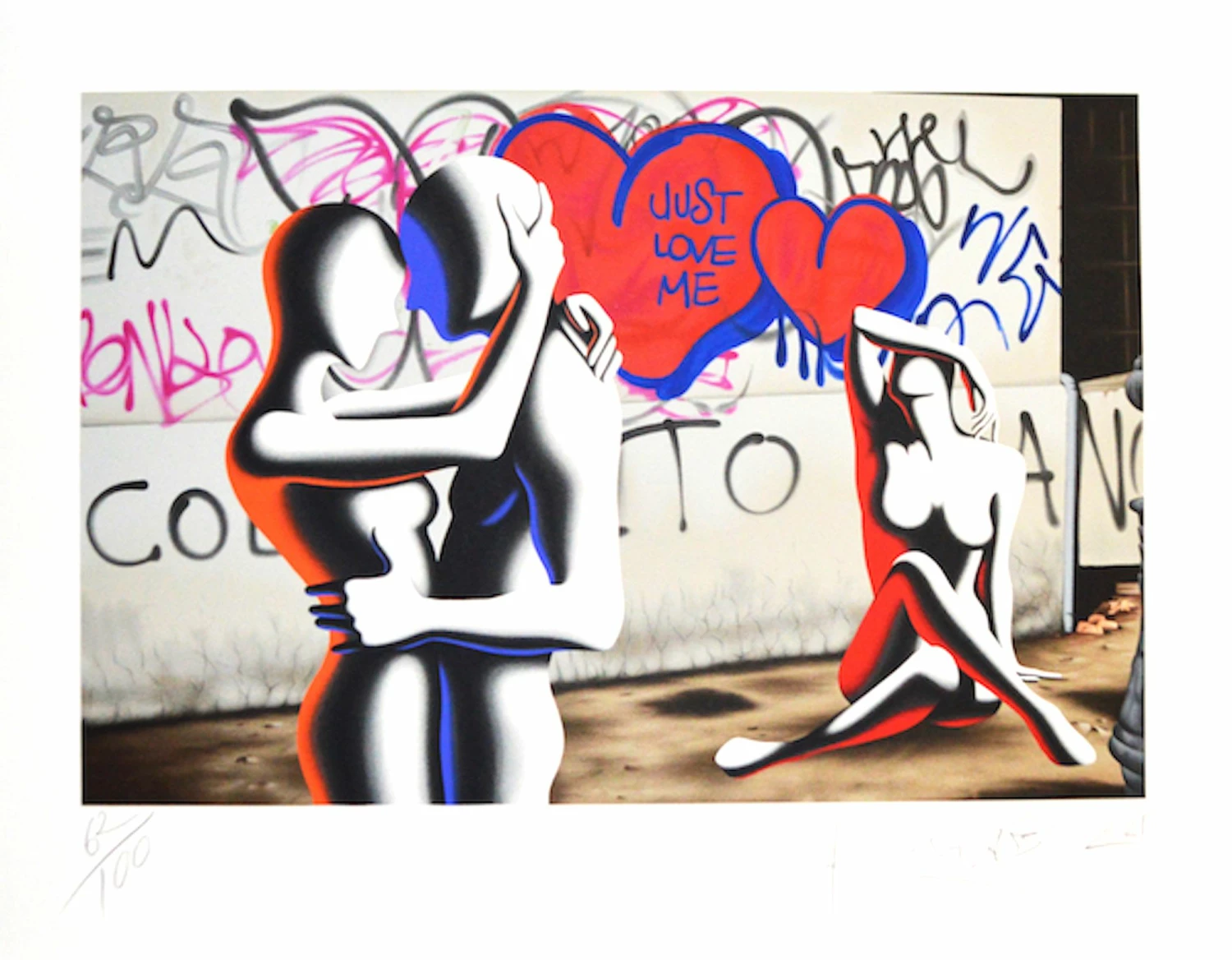 Serigrafia in edizione limitata di Mark Kostabi, Just Love Me mostra le inconfondibile sagome di amanti di Kostabi su di uno sfondo urbano in cui spicca un muro con sopra scritte e murales.