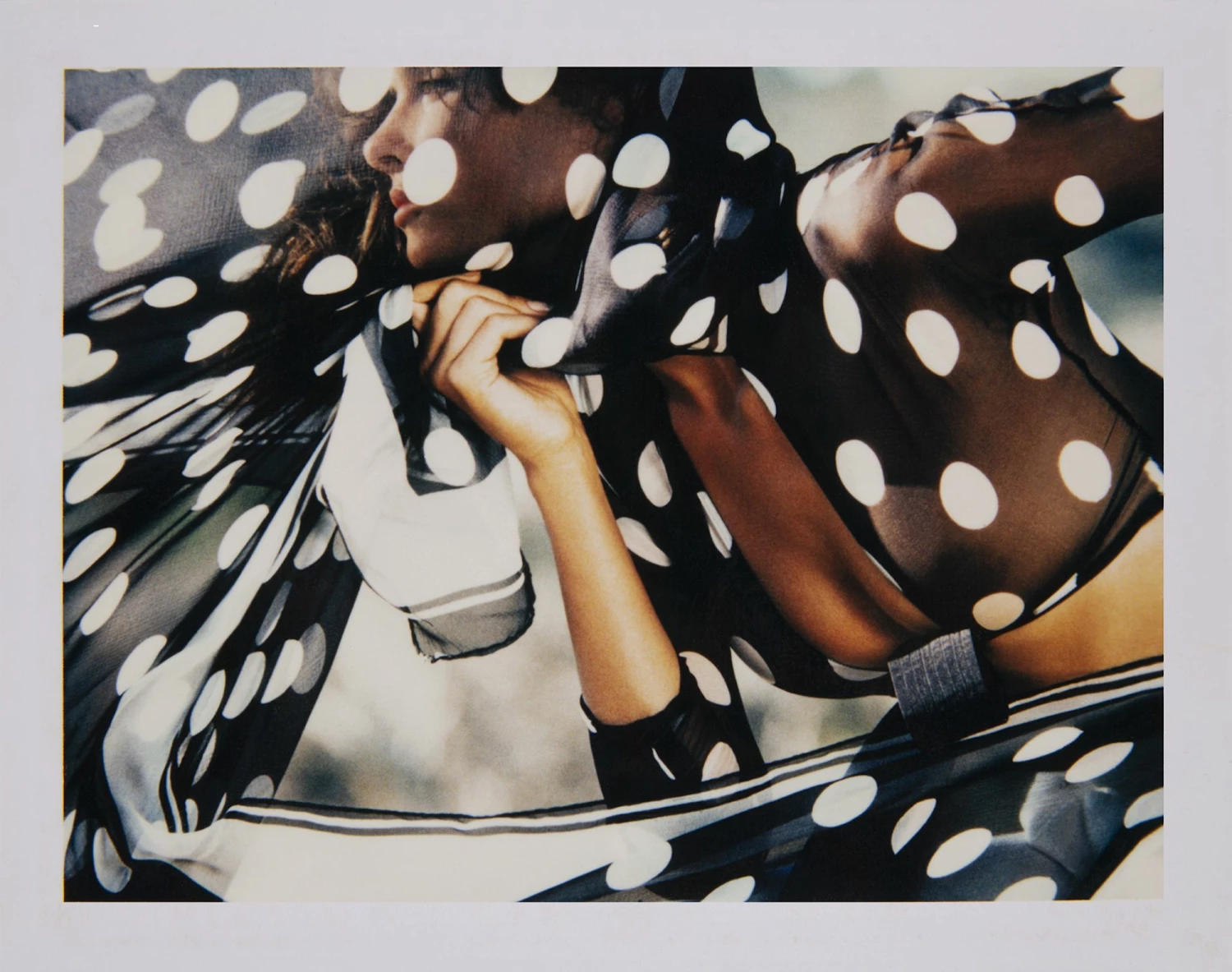 La fotografia di Marco Glaviano, Kenna misura 10,7×8,5 cm ed è una polaroid firmata sul retro in originale dall’artista. La modella viene fotografata in questo scatto unico da Marco Glaviano mentre posa di profilo con un foulard a pois.
