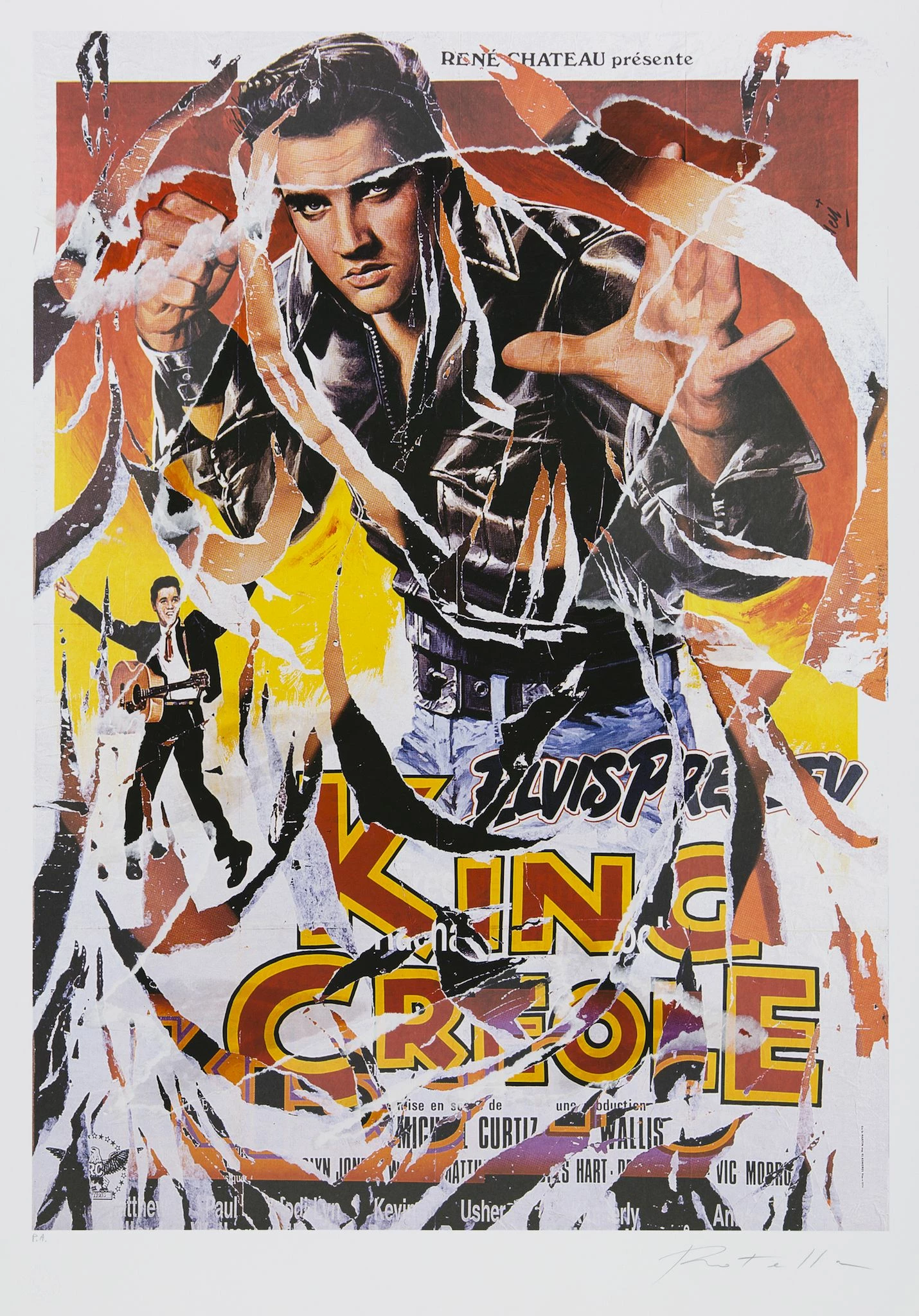 Mimmo Rotella celebra l’icona del rock Elvis Presley in questo SeriDécollage ispirato alla locandina del film diretto da Michael Curtiz King Creole (La via del male) del 1958. Chi se non il giovane ribelle per eccelenza poteva interpretare il ruolo di protagonista in King Creole? James Dean era stato scritturato per la parte di Danny Fisher, studente che si lascia trascinare da una banda di teppisti che vivono di furti, rapine e aggressioni; ma la scomparsa improvvisa del bello e dannato per eccellenza, in un incidente d’auto, nel 1955, gli impedì di recitare sotto la sapiente direzione di Michael Curtiz e a sostituirlo fu il carismatico e affascinante Elvis.