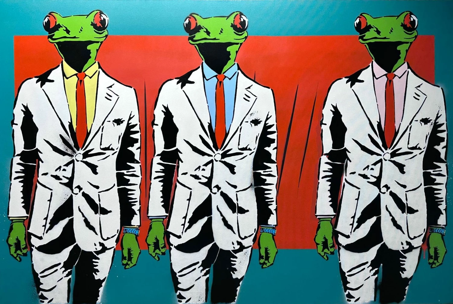 Su uno sfondo colorato campeggiano delle figure insolite, dal corpo umano e la testa di ranocchio. Attraverso un interessante mash-up, Mr. Savethewall dà vita al suo prodotto più iconico. L’uomo-ranocchio, in giacca e cravatta e con un luccicante gioiello al polso, incarna le contraddizioni sociali del ventunesimo secolo. Riproponendo il soggetto più volte in Kiss Me Composition, Mr. Savethewall ne amplifica il messaggio. Sotto gli abiti di affidabilità e prestigio, può nascondersi niente più che un ranocchio.