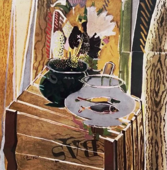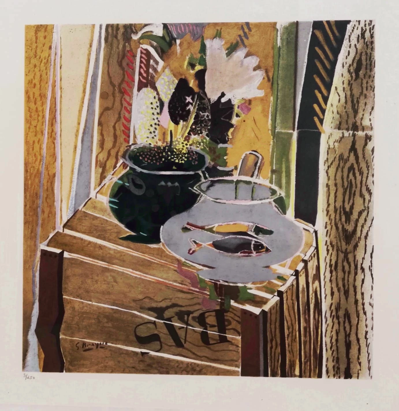 La stupenda litografia mostra una scena d’interno: un acquario contenete due pesci è appoggiato sopra una cassa affiancato da un bellissimo vaso di fiori colorati. L’atmosfera è come fosse sospesa e incantata: gli oggetti rimandano a una presenza umana assente ma che riusciamo quasi a percepire. La scena è rappresentata secondo lo stile cubista: il senso della prospettiva e della realtà vengono meno per lasciare spazio a una rappresentazione prettamente geometrica della realtà.