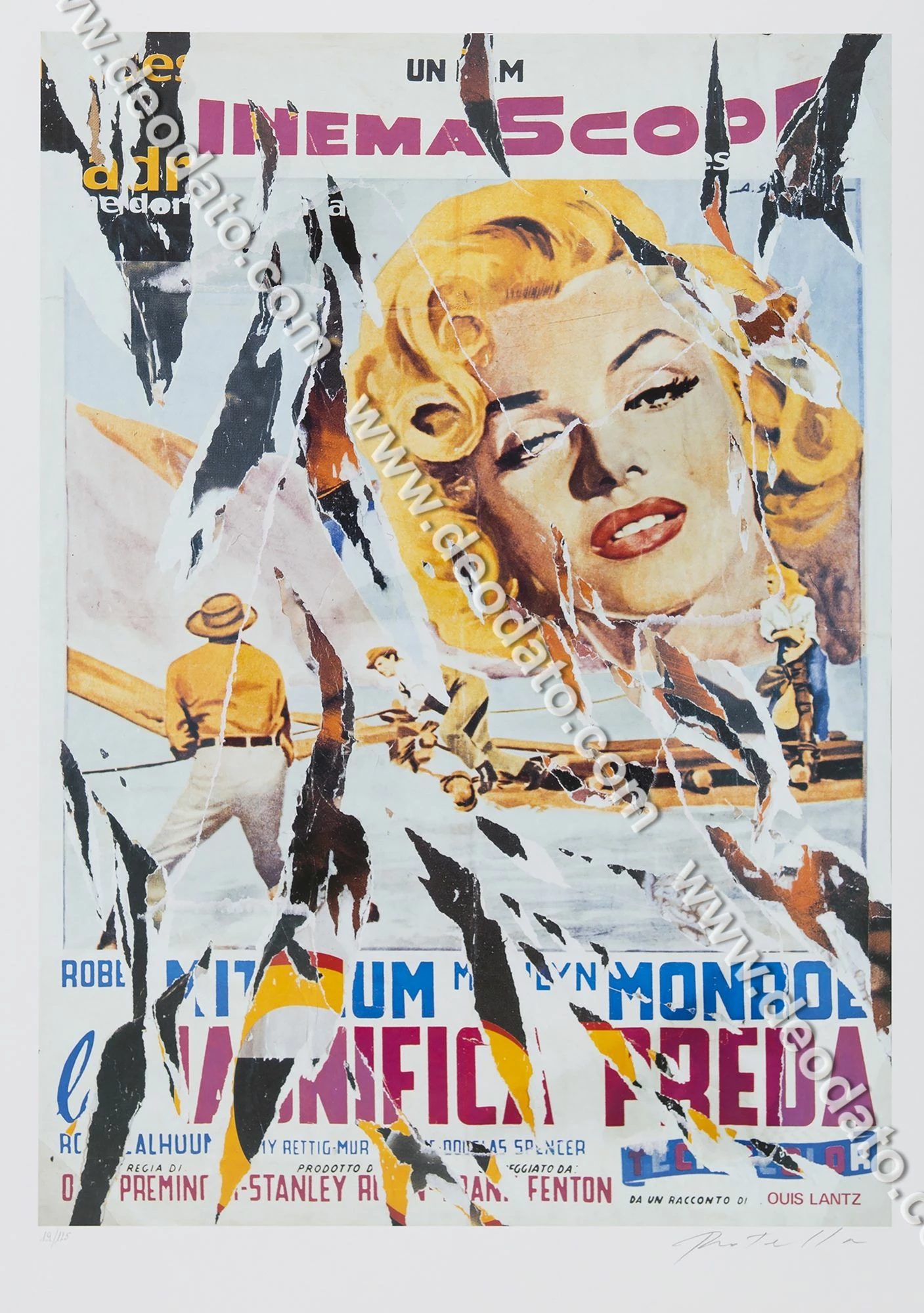 SeriDécollage ispirato al manifesto di La Magnifica Preda (River of No Return) del 1954. Mimmo Rotella omaggia l’unico film western diretto dal celebre regista Otto Preminger e interpretato da un’imprevedibile Marilyn Monroe con poco trucco e abiti tutt’altro che sofisticati. Il volto della splendida Marilyn, già protagonista della locandina originale del film, viene ulteriormente esaltato da Rotella che circonda lo sguardo sensuale della diva con i suoi strappi fatti a mano. Questi assumono l’aspetto di graffi incisi sul manifesto, come fossero realizzati dai predatori che si contendono La Magnifica Preda. Dalla tradizione western, trama avvincente, miniere d’oro, imboscate degli indiani, giocatori d’azzardo e saloon, dove la Monroe esibisce il suo temperamento ammaliante e la sua voce sensuale interpretando ben quattro canzoni. Una Marilyn coi jeans, top aderenti e scollati e capelli lunghi fino alla vita, che si trova ad affrontare il Fiume Senza ritorno (dal titolo originale River of no Return) infido e insidioso, ma unica via di fuga dall’assalto dei pellerossa nel selvaggio west. Una Marilyn inedita e imperdibile, sensuale e bellissima anche in una parte così lontana dal suo stile affermato di icona vamp.