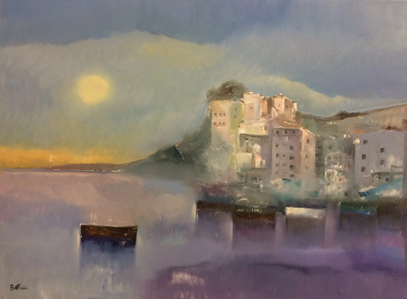 Un altro tema molto forte nelle sue opere è quello delle “Vele Bianche”, navi guidqate verso casa solo dalla luce della luna. Un’atmposfera magica che circonda il porto e le navi data dall’uso di sfumature di colore di blu, viola, bianco e che ferma lo scorrere del tempo in una condizione quasi irreale, anche se tutto intorno sembra realistico.