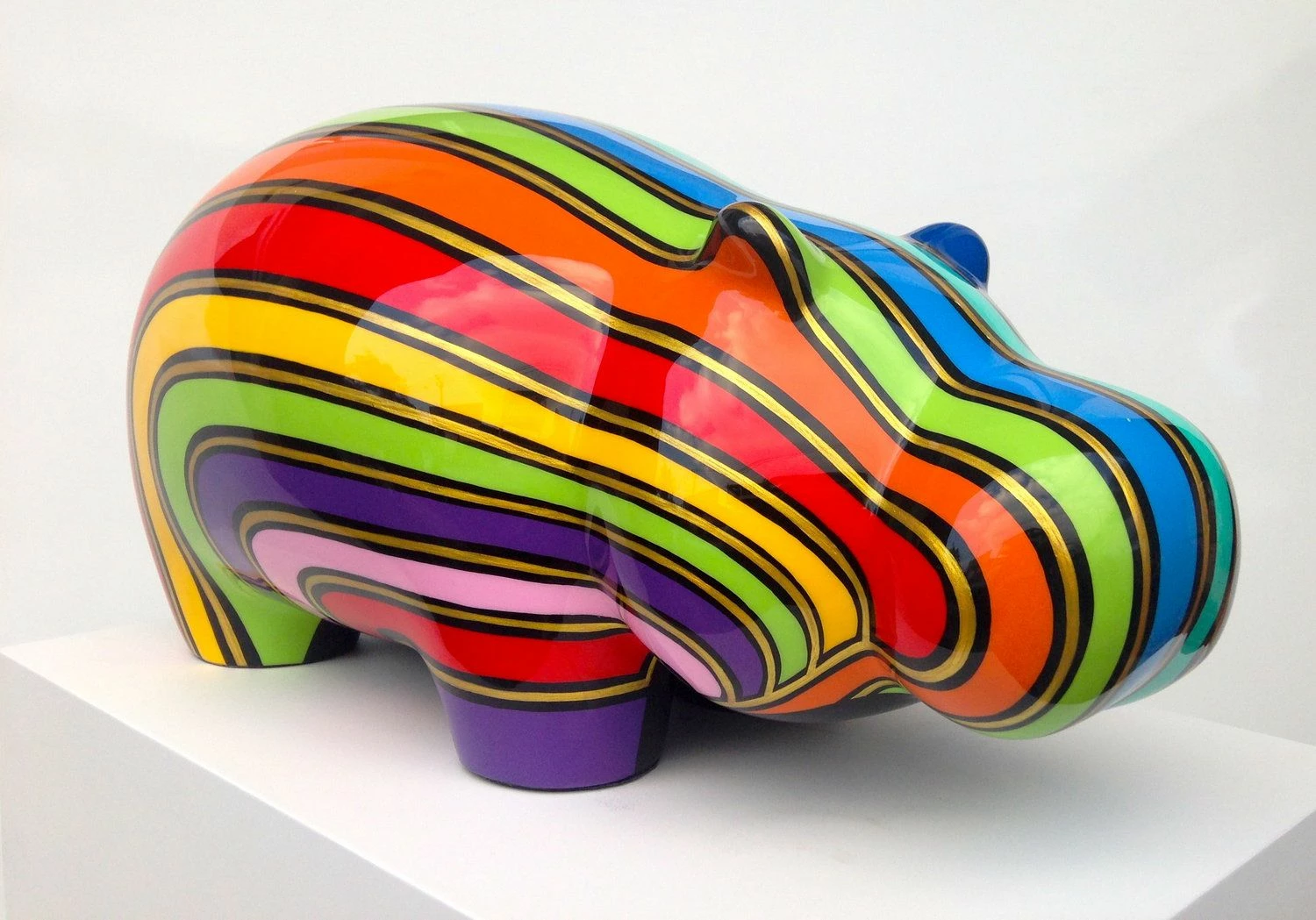 L’iconico ippopotamo Lucky è realizzato in polvere di marmo e resina, creando così un materiale resistente che rende adatta la scultura anche per gli ambienti esterni. L’ippopotamo è interamente dipinto a mano e infine laccato e firmato in originale.