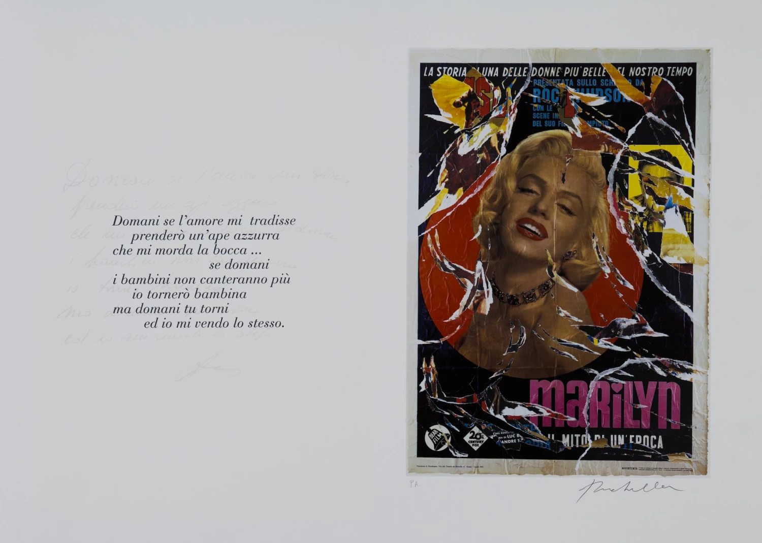 Dècollages di Mimmo Rotella proveniente dal libro: “MARILYN Bellezza eterna”, di Mimmo Rotella e Alda Merini. Questo celebre Dècollages è abbinato ad una Poesia inedita di Alda Merini, proprio come tutti gli altri Dècollages presenti nel libro; tiratura: 199 esemplari, tutti firmati e numerati. Da sempre musa ispiratrice di Rotella, Marilyn rappresenta non solo per lui, ma per tutto il mondo, il mito-icona di un’epoca, destinata a rimanere immortale.