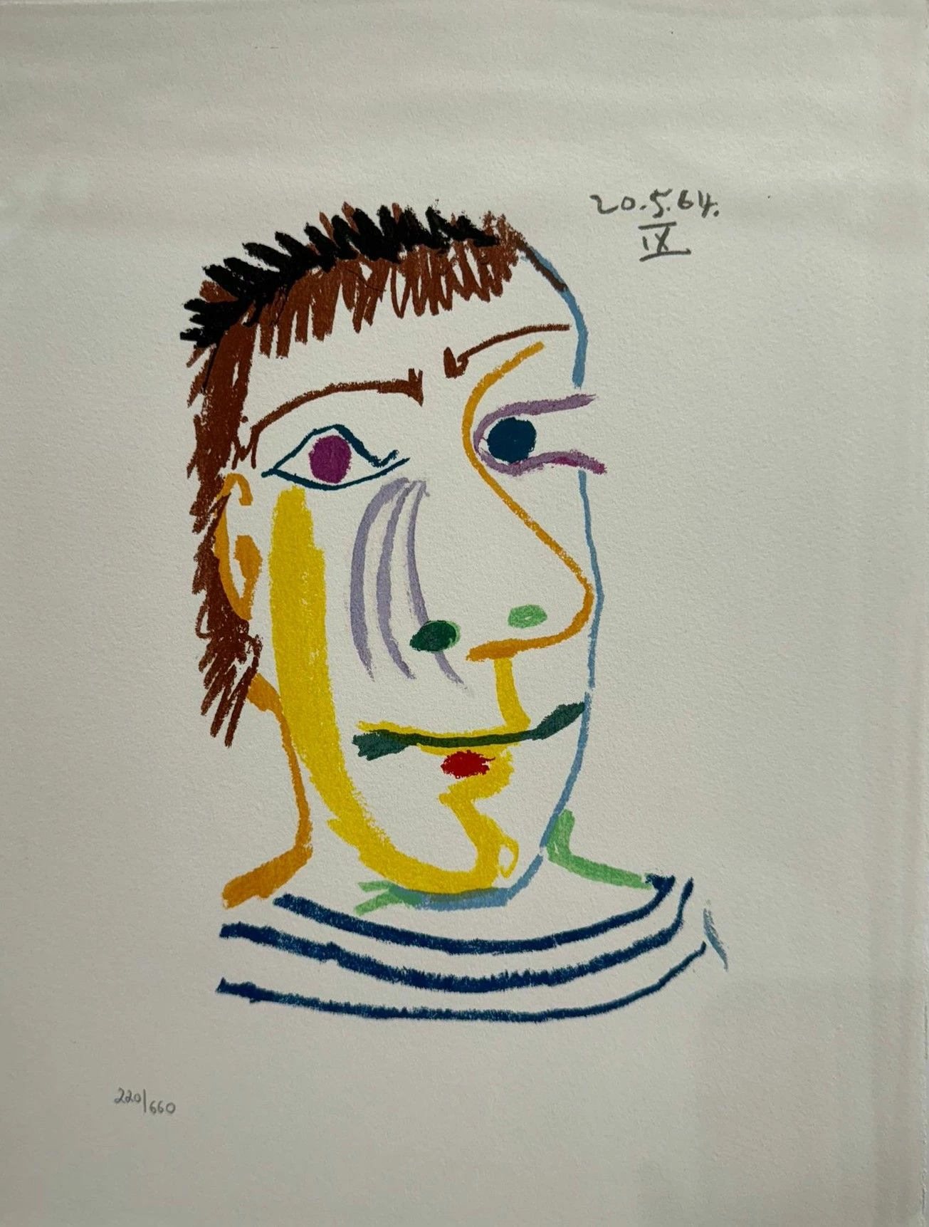 In questa opera, Picasso rappresenta un volto di quello che sembra essere un uomo. I colori sono spesso vibranti e vivaci, con tonalità che si allontanano dalla rappresentazione realistica e che potrebbero apparire quasi innaturali. L’uso di linee spezzate e forme geometriche caratteristiche del cubismo conferisce all’opera un aspetto dinamico e moderno, quasi uno schizzo trascinato dalla sua espressività artistica.