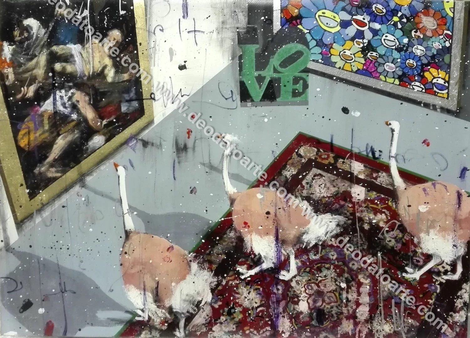 L’artista, oltre agli Struzzi, inserisce nei medesimi ambienti altri soggetti sempre estranei al contesto: Rinoceronti, Navi, Aerei, personaggi dei Minions e dei Simpson.