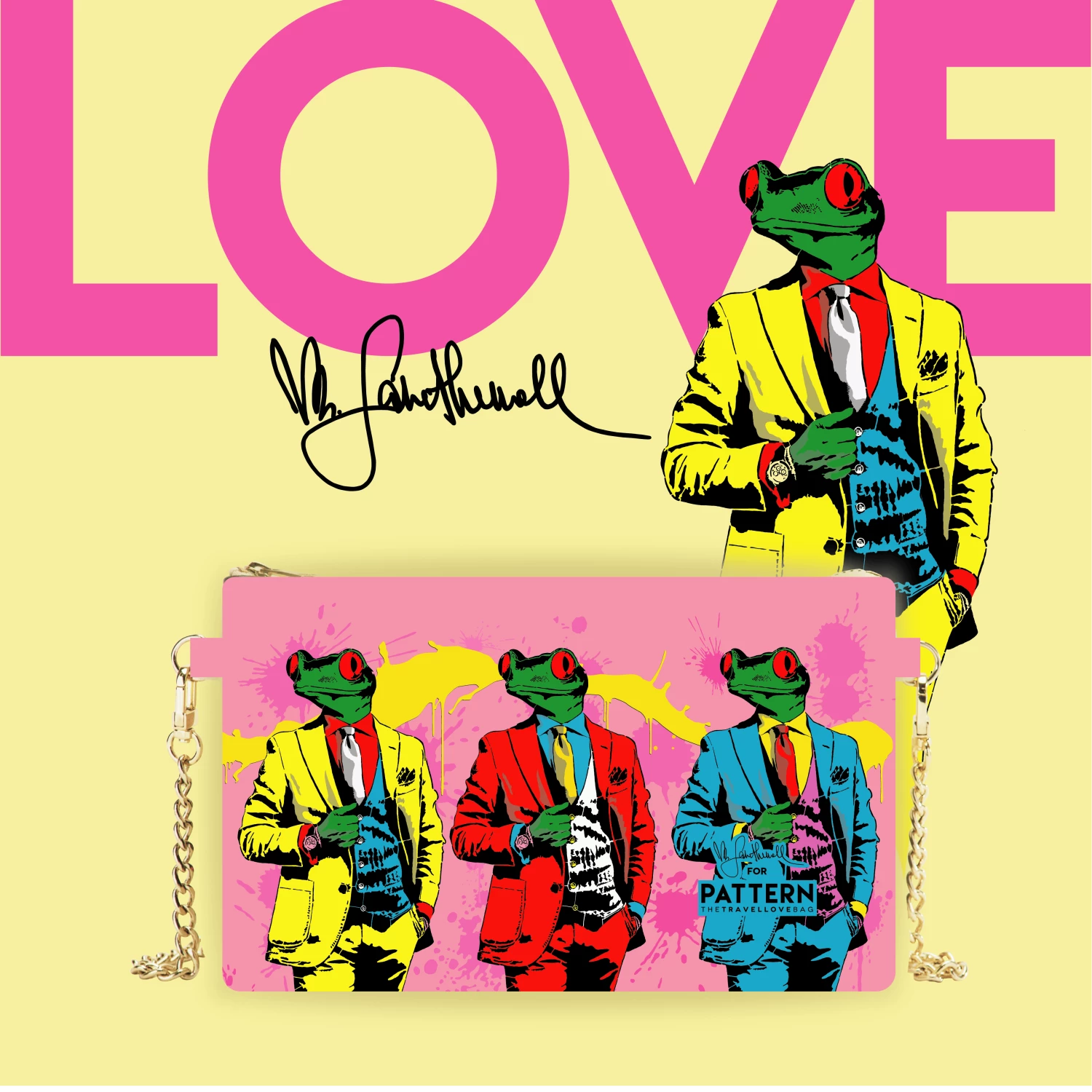 La Miss Weekend Made in Italy sempre con te con la tracolla dorata. Dall’incontro con l’artista Mr Savethewall nasce questa bag con gli iconici ranocchi protagonisti dell’opera best seller “Kiss Me!”. La tua opera d’arte preferita da portare sempre con te!
