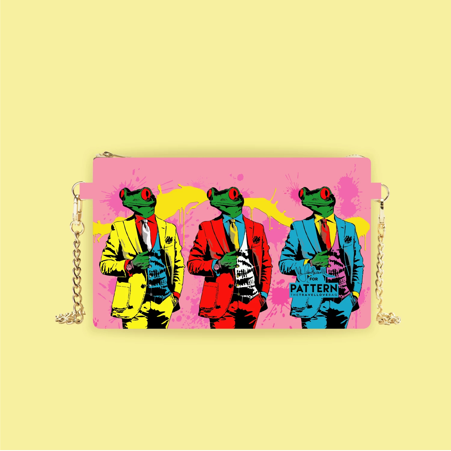 L’astuccio stampato su pelle sintetica con design originale di Pattern-thetravellovebag per Mr Savethewall: i celebri ranocchi nella versione multicolor su sfondo rosa!