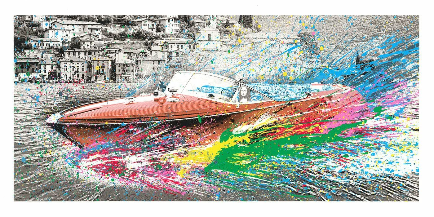 I toni accesi dell’imbarcazione, circondata da schizzi colorati che evocano i motivi caratteristici di Mr. Brainwash, si stagliano sullo sfondo in bianco e nero. Attraverso un gioco di contrasti e richiami, la forza creatrice dello street artist assorbe ed esalta i simboli della Dolce Vita – il paesaggio in lontananza e l’emblematico Riva in primo piano – in una dialettica senza tempo, che unisce l’arte, il lusso e l’elogio alla ricchezza dei territori del Lago d’Iseo.