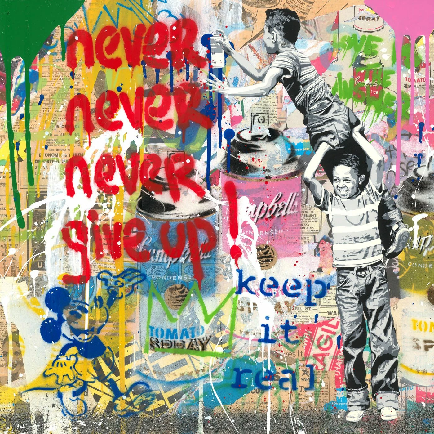 L’opera unica di Mr. Brainwash, Never Never Give Up! è stata realizzata con tecnica mista su carta. L’artista Mr. Brainwash riesce a coniugare diverse tecniche artistiche come l’uso della bomboletta, lo stencil, il dripping e il collage.