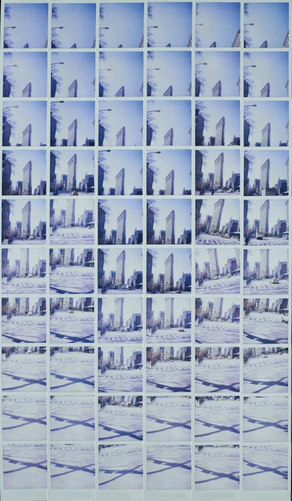 Maurizio Galimberti ci offre una panoramica particolare della città di New York. Attraverso il progetto Flat Iron, realizza una serie di mosaici di Polaroid con soggetto il famoso Flatiron Building sulla 5th Ave ripreso da varie angolazioni e prospettive. Da questi mosaici, che sono pezzi unici, ricava cinque stampe lambda da ognuno. Questa in particolare è la n°1/5 derivante dall’originale New York Flat n°3 del 28/2/2008. Le immagini iniziano dal basso con l’asfalto, le strisce pedonali e le ombre dei semafori per poi salire verso la punta del Flatiron Building.