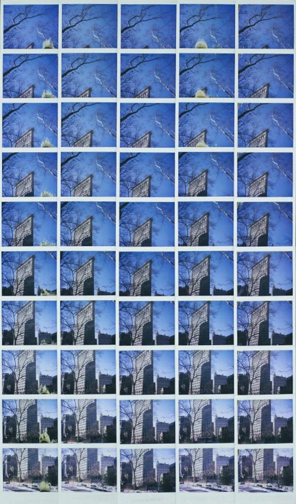 Maurizio Galimberti ci offre una panoramica della città di New York, attraverso il progetto Flat Iron, realizzando una serie di mosaici di Polaroid con soggetto il famoso Flatiron Building sulla 5th Ave ripreso da varie angolazioni e prospettive. Da questi mosaici, che sono pezzi unici, ricava cinque stampe lambda da ognuno. Questa in particolare è la n°1/5 derivante dall’originale New York Flat n°4 del 24/2/2008. Il Faltiron si staglia su un cielo azzurro senza nuvole, l’ombra di un palazzo copre una parte dell’edificio incorniciato dai rami di un albero. Sono visibili in alcune immagini gli interventi manuali dell’artista sulle Polaroid stesse.