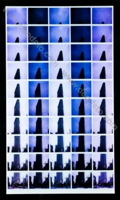 Maurizio Galimberti ci offre una panoramica della città di New York, attraverso il progetto Flat Iron, realizzando una serie di mosaici di Polaroid con soggetto il famoso Flatiron Building sulla 5th Ave ripreso da varie angolazioni e prospettive. Da questi mosaici, che sono pezzi unici, ricava cinque stampe lambda da ognuno. Questa in particolare è la n°1/5 derivante dall’originale New York Flat n°5 del 23/2/2008. In questa stampa, le immagini sono divise in colonne alternativamente sui toni del viola chiaro e del viola scuro.